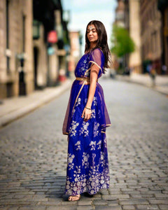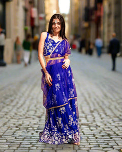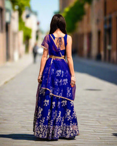 • Handmade Silk Georgette Embroidered Persian Blue Lehenga Set