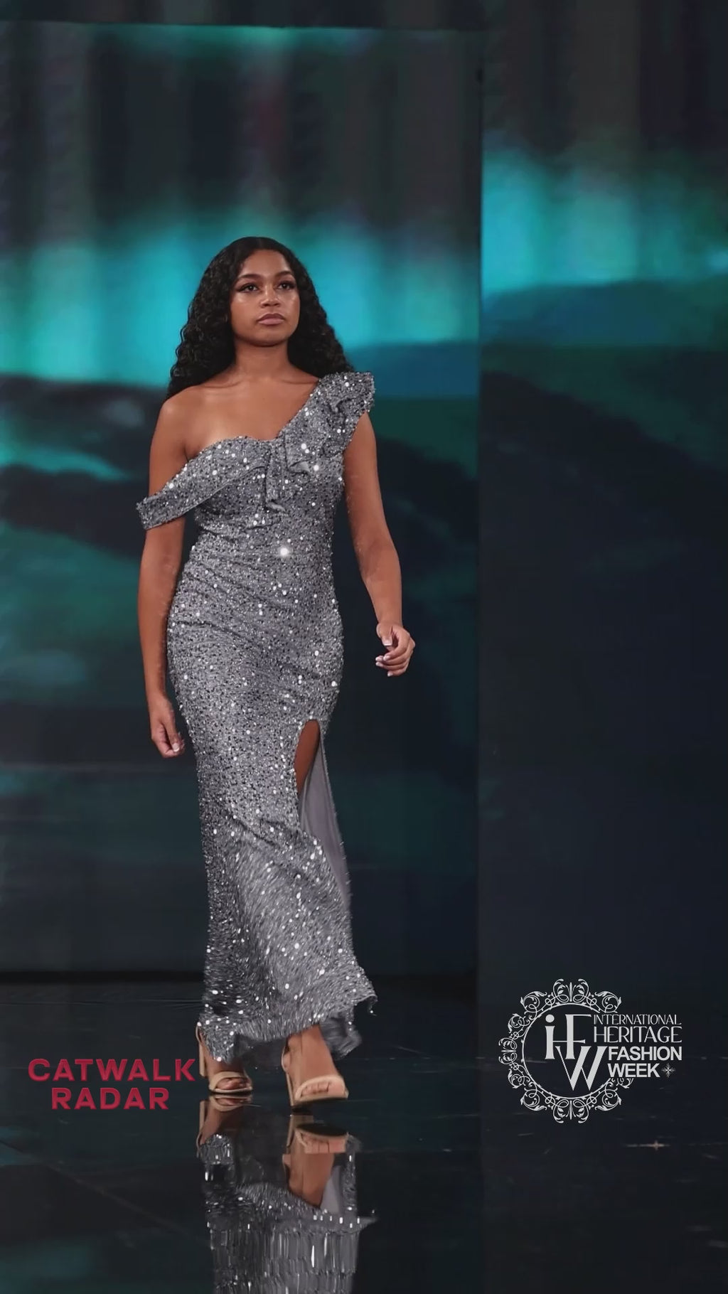 A radiant expression of modern glamour, this silver sequin gown is designed to captivate with its sculptural elegance and luminous detailing. Featuring a dramatic asymmetrical neckline adorned with soft ruffle accents, this gown balances bold structure with feminine movement. The shimmering sequin surface reflects light beautifully, creating a fluid, radiant effect with every step.