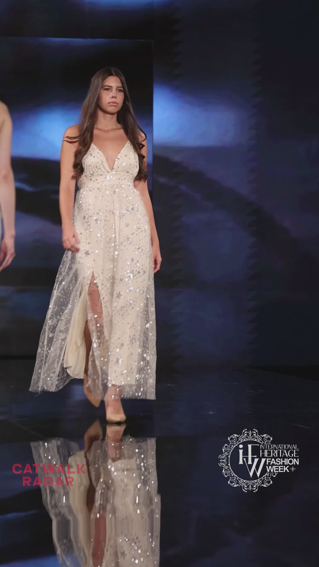 Soft, radiant, and effortlessly elegant, this ivory evening gown is a celebration of timeless femininity and delicate craftsmanship. Designed with a plunging V-neckline and flowing silhouette, the gown is adorned with shimmering star-like embellishments that catch the light with every movement. The sheer overlay creates a dreamy, ethereal finish, while the softly structured bodice enhances the natural form.