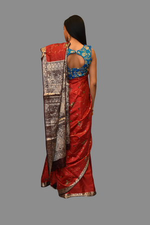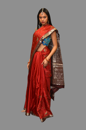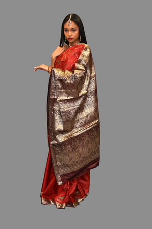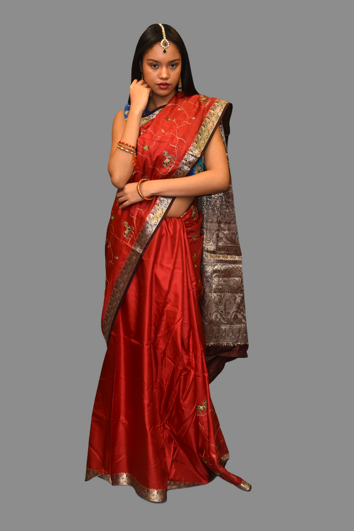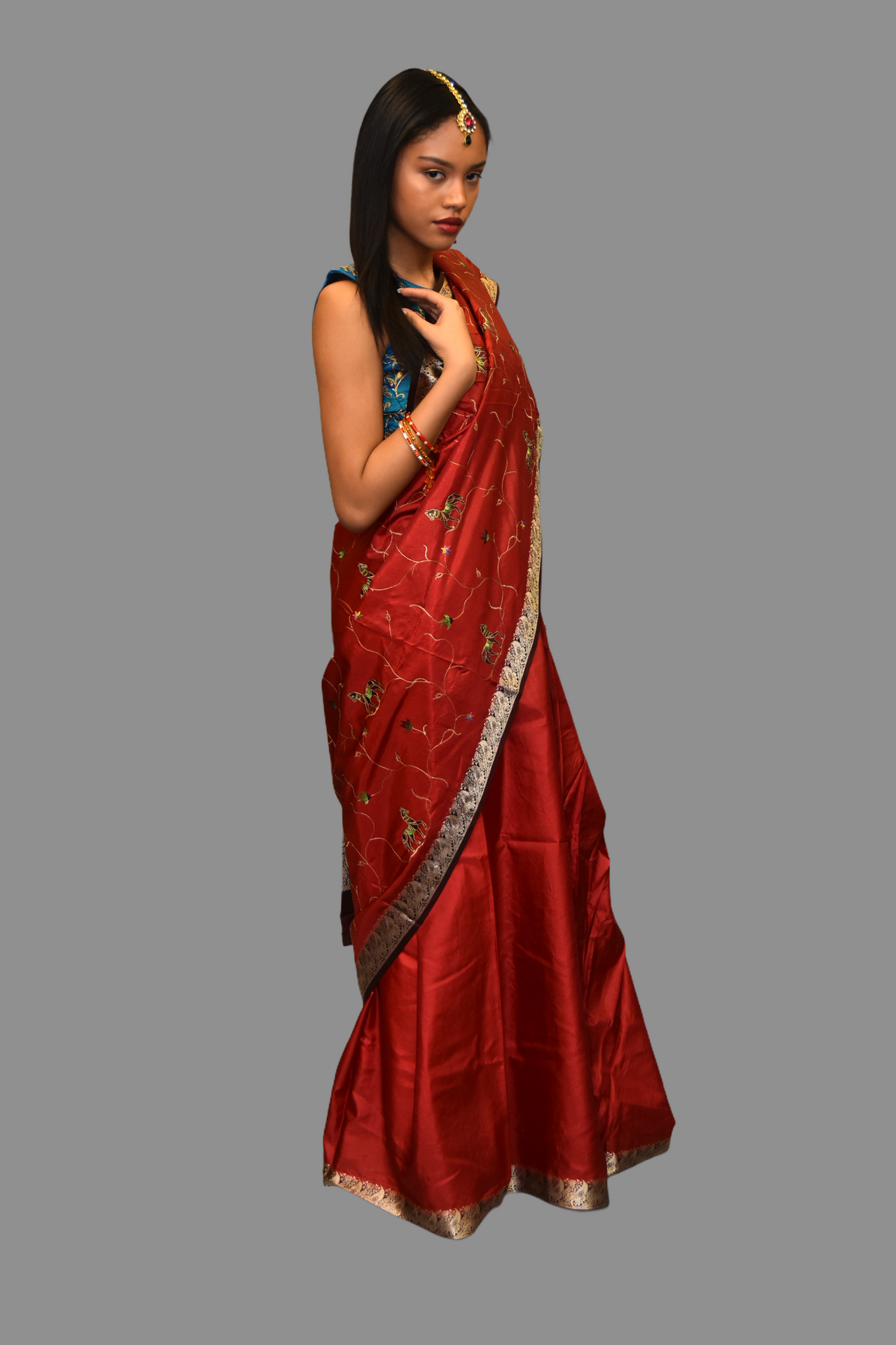 • Handmade Silk Embroidered Ruby Red With Contrast Chocolate Brown Border Saree
