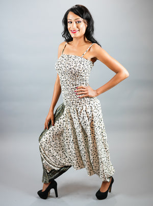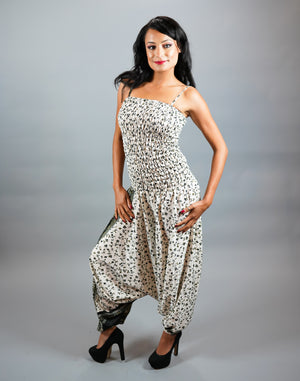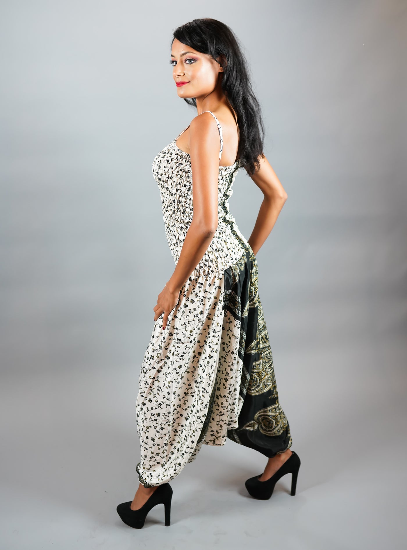 • Handmade Silk Block Printed Pearl White With Black Jumpsuit