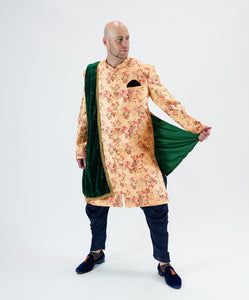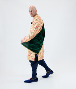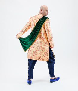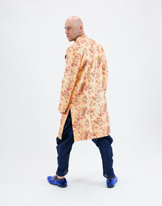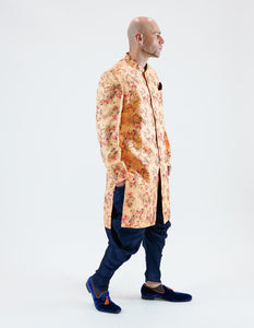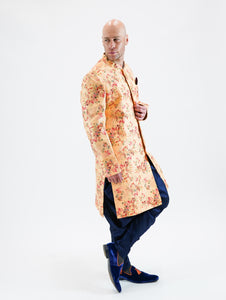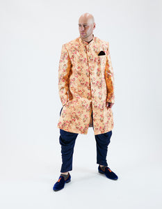 Silk Brocade Flower Print Salmon Red Sherwani / Jacket
