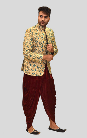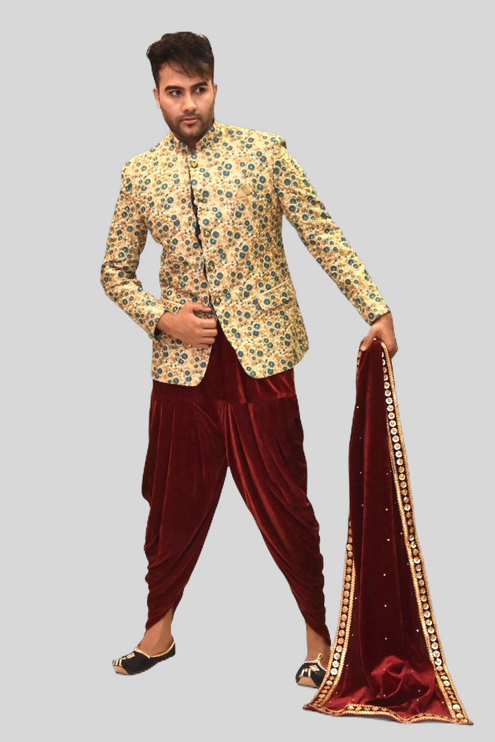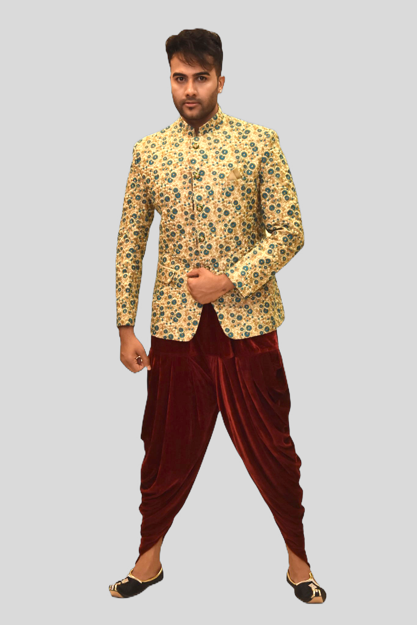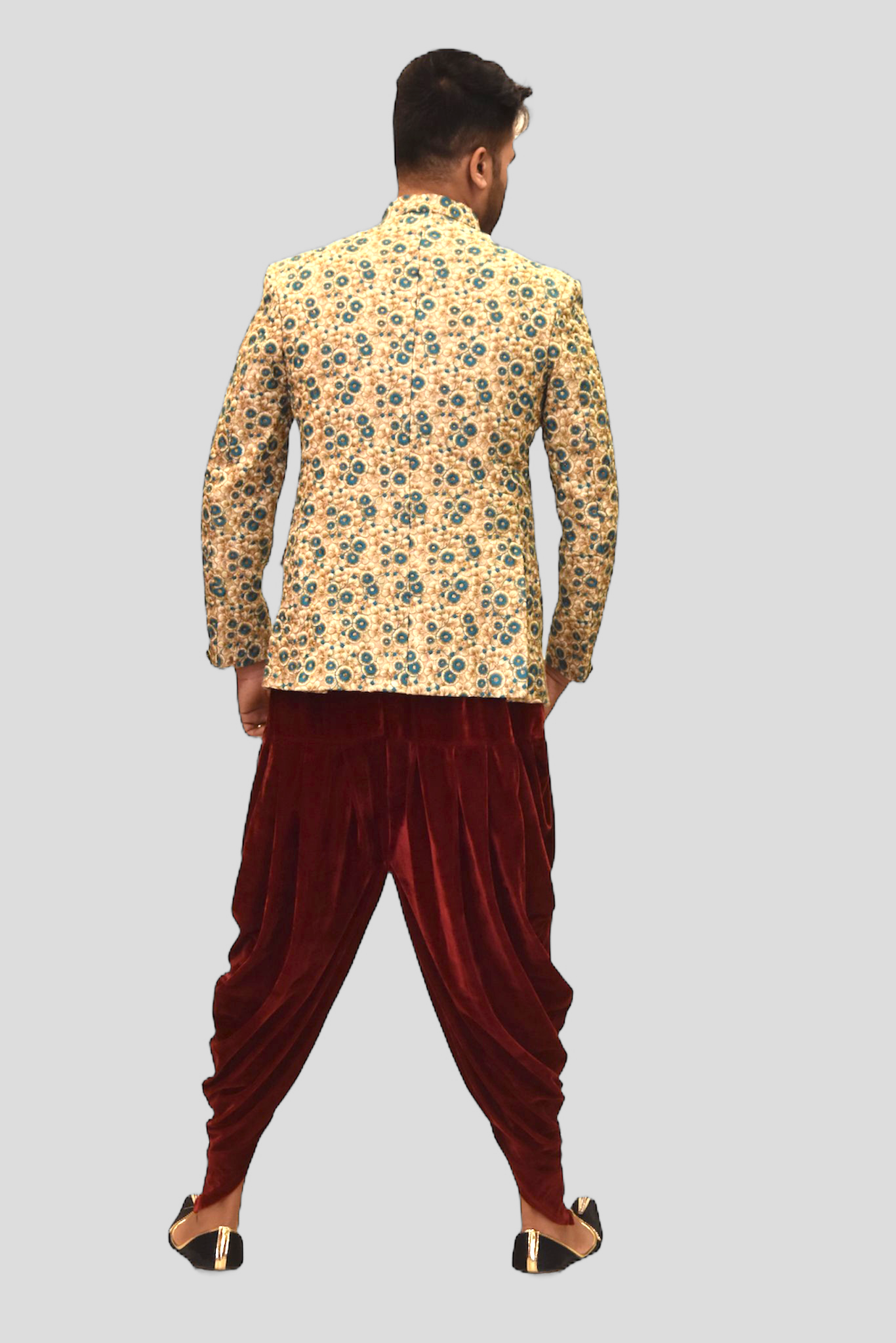 Silk Heavy Embroidered Gardenia Cream And Teal Blue Short Jacket / Bandhgala