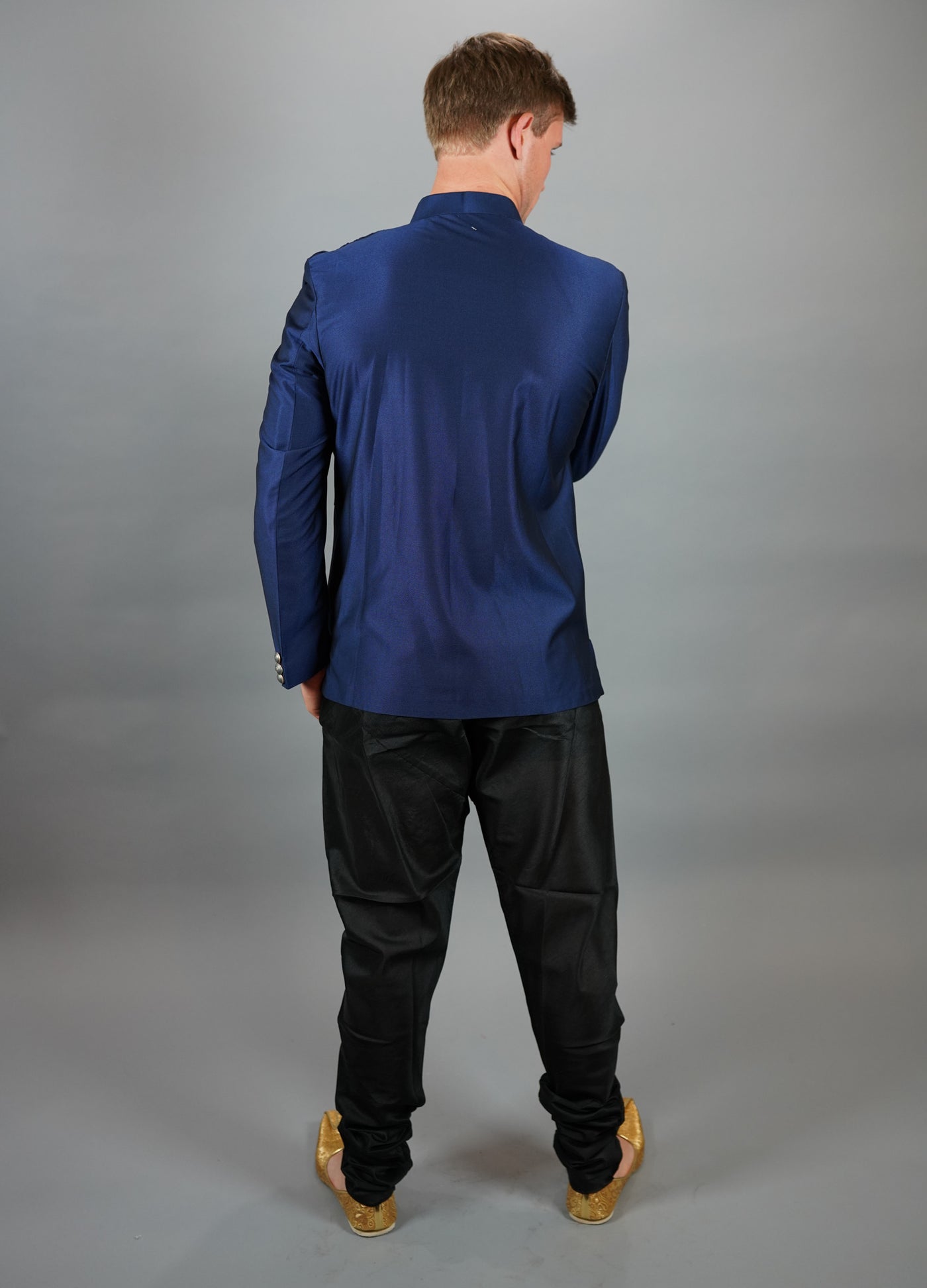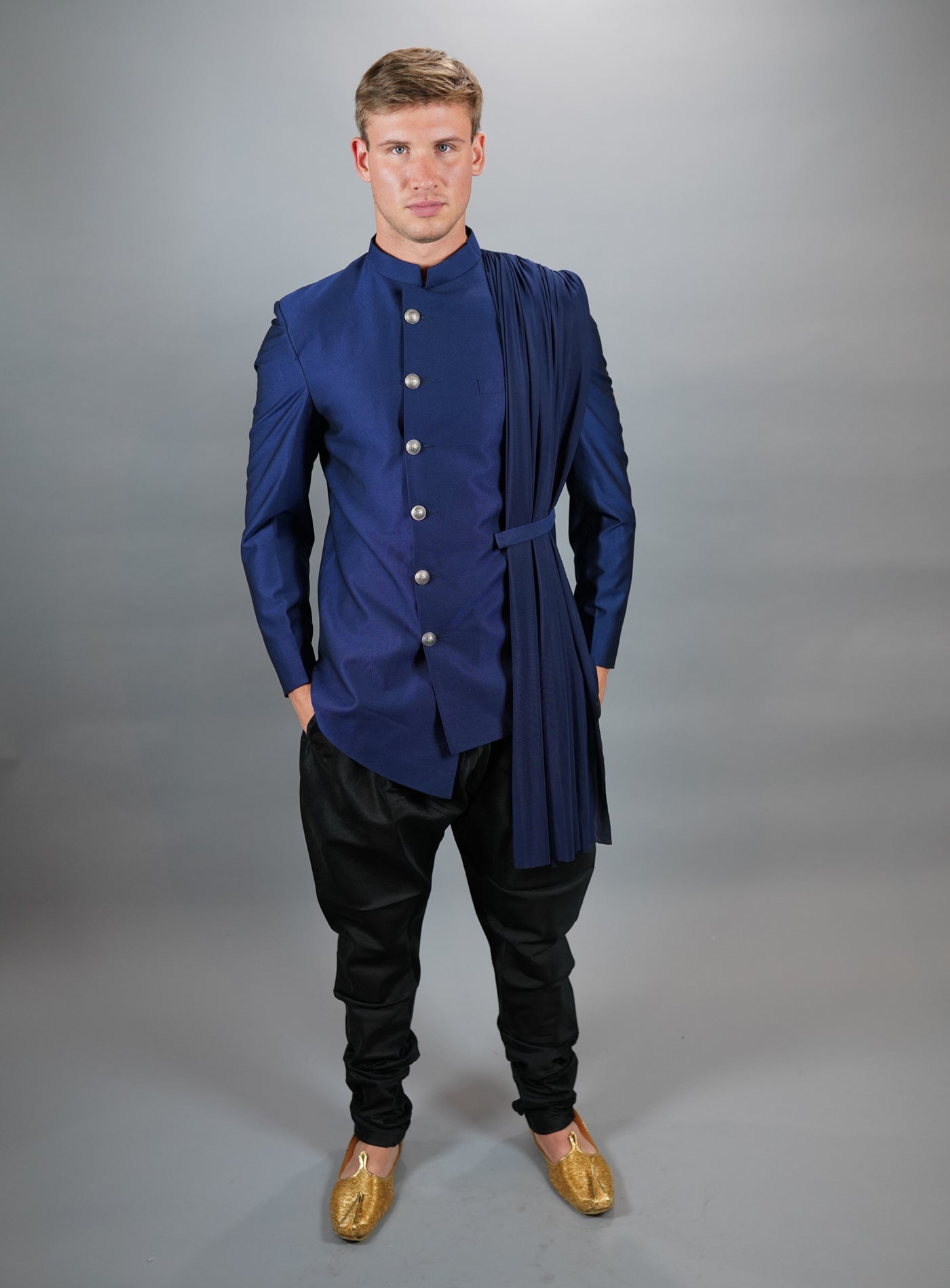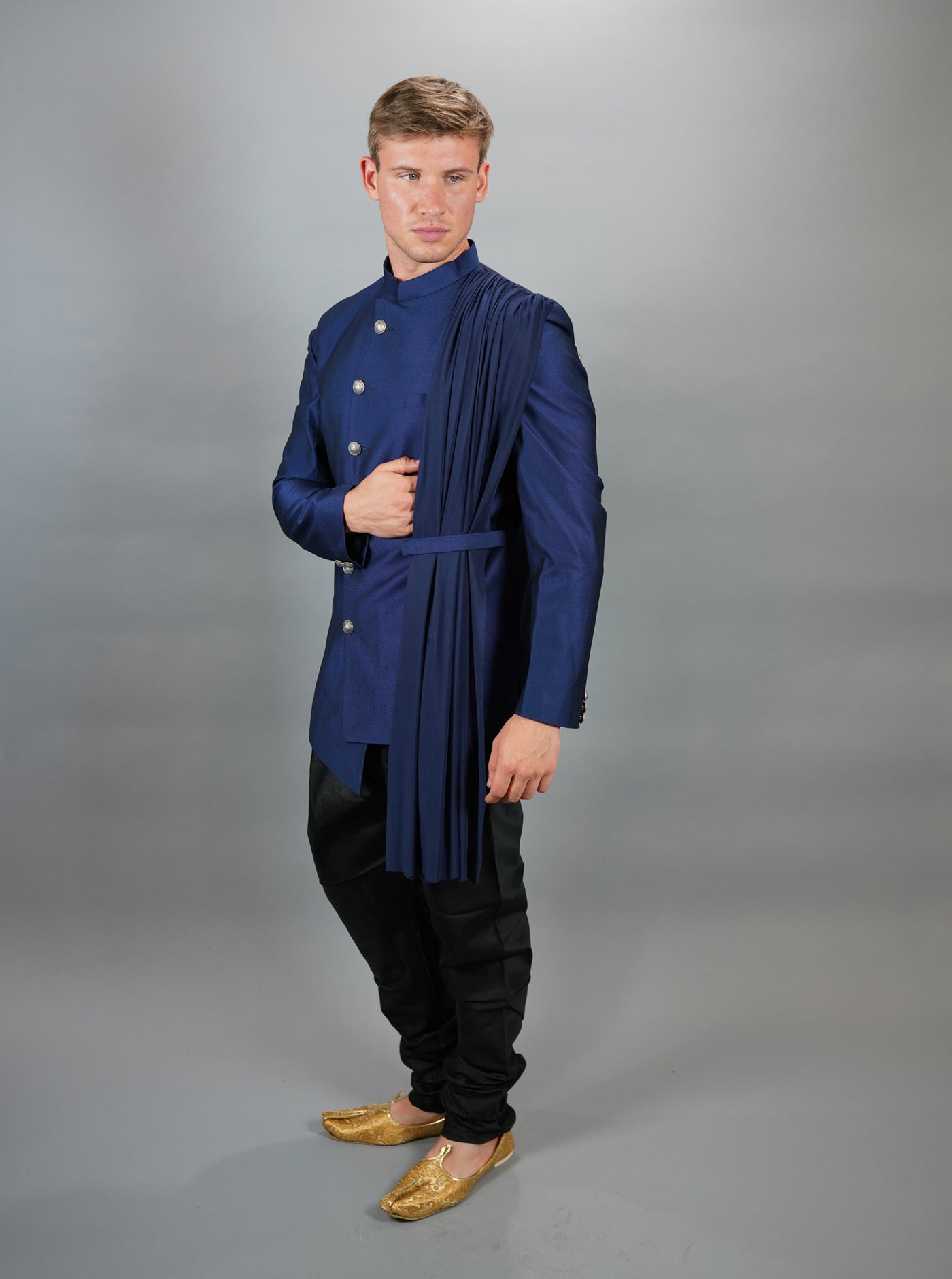 • Handmade Silk Royal Blue Asymmetric Bandhgala With Attached Scarf Jacket