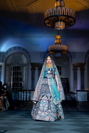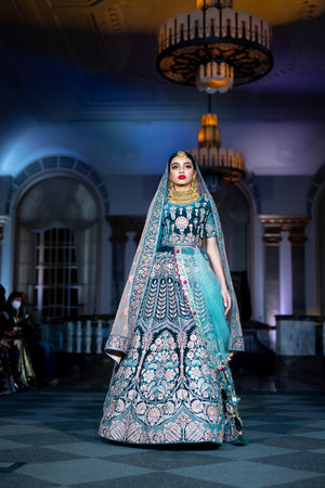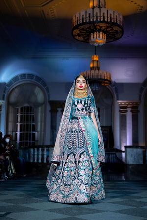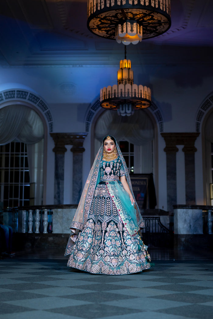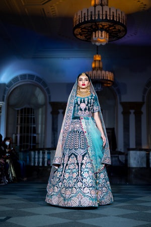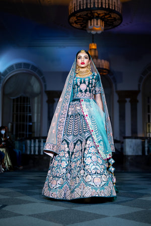 • Handmade Soft Velvet Peacock Blue Heavy Embroidered Bridal Lehenga Set