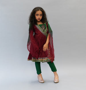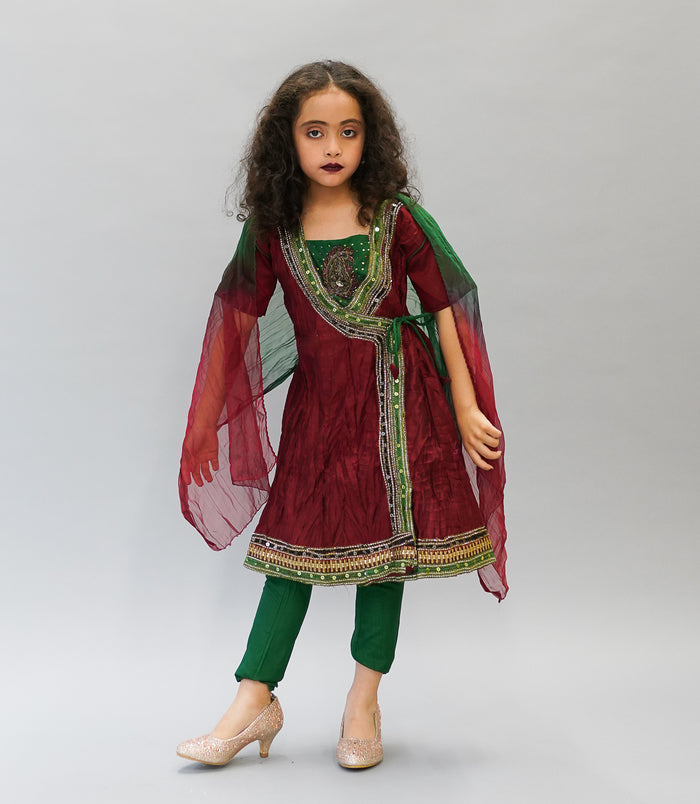 • Handmade Cotton Barn Red Angrakha Style Embroidered Girl's Salwar Suit
