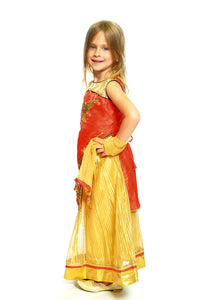 • Comes With Long Coral Red Embroidered Top , Gold Skirt & Scarf