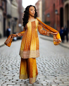 Fancy Silk Heavy Embroidered Shaded Ginger Brown & Amber Yellow Sharara Pants Suit