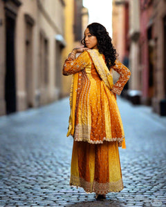 • Handmade Fancy Silk Heavy Embroidered Shaded Ginger Brown & Amber Yellow Sharara Pants Suit