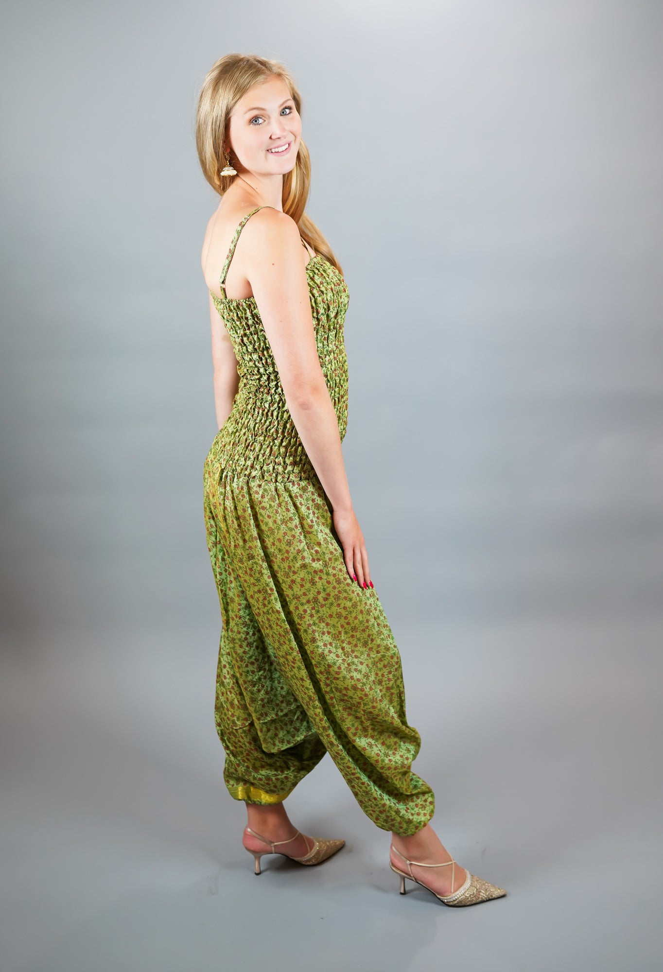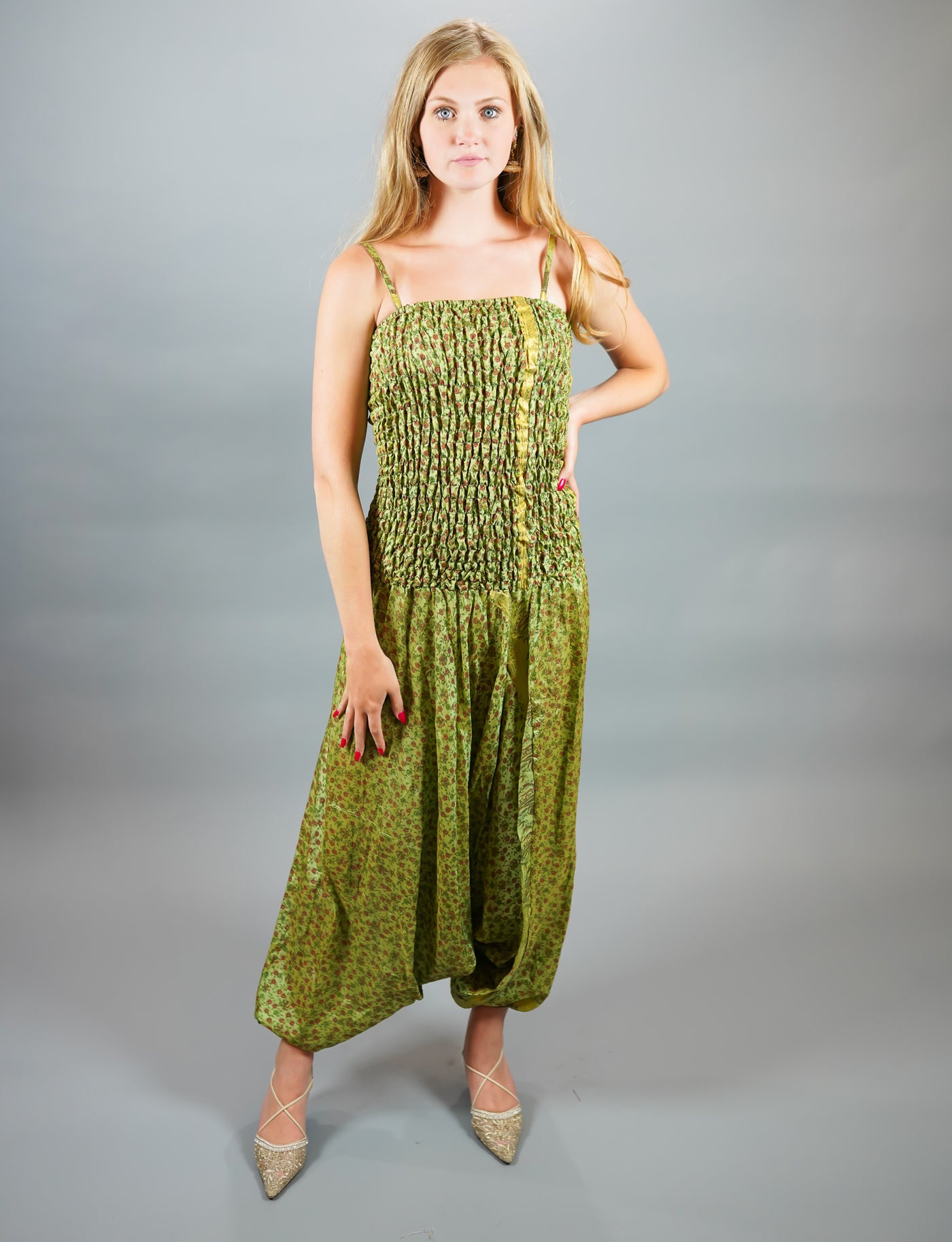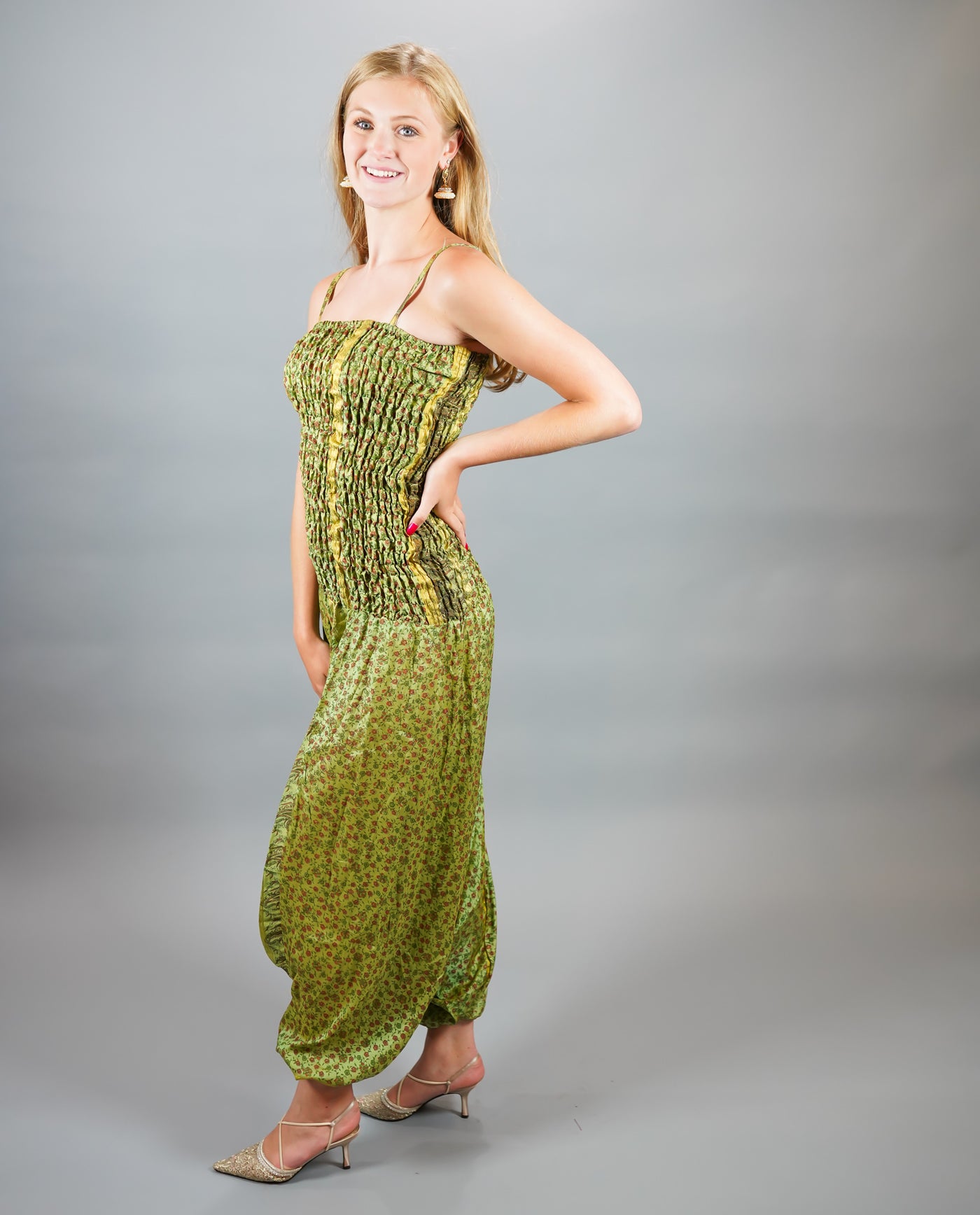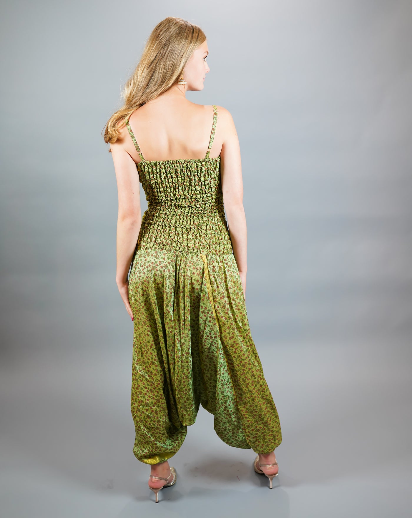 • Handmade Silk Block Printed Floral Army Green Jumpsuit