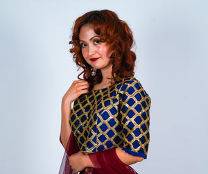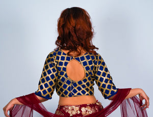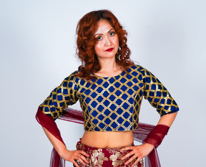 • Handmade Formal Silk Navy Blue Crop Top with Three Quarter Sleeves