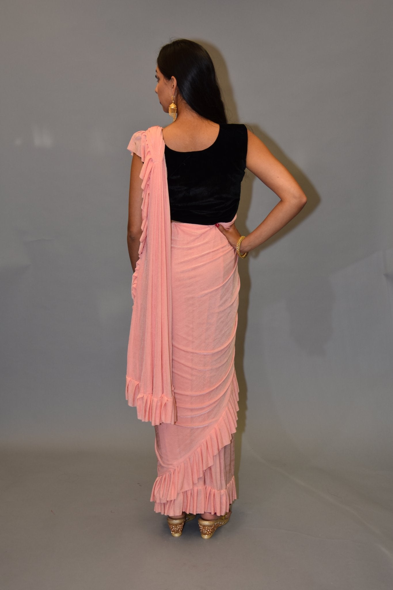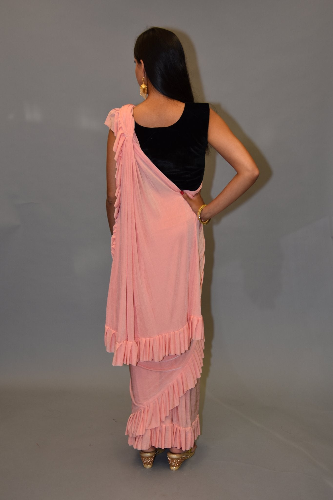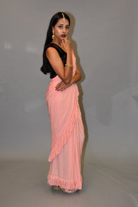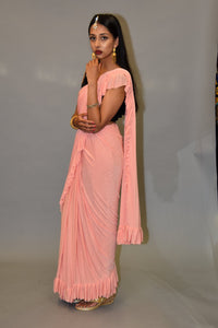 • Handmade Silk Flamingo Pink Pleated Ruffle Saree