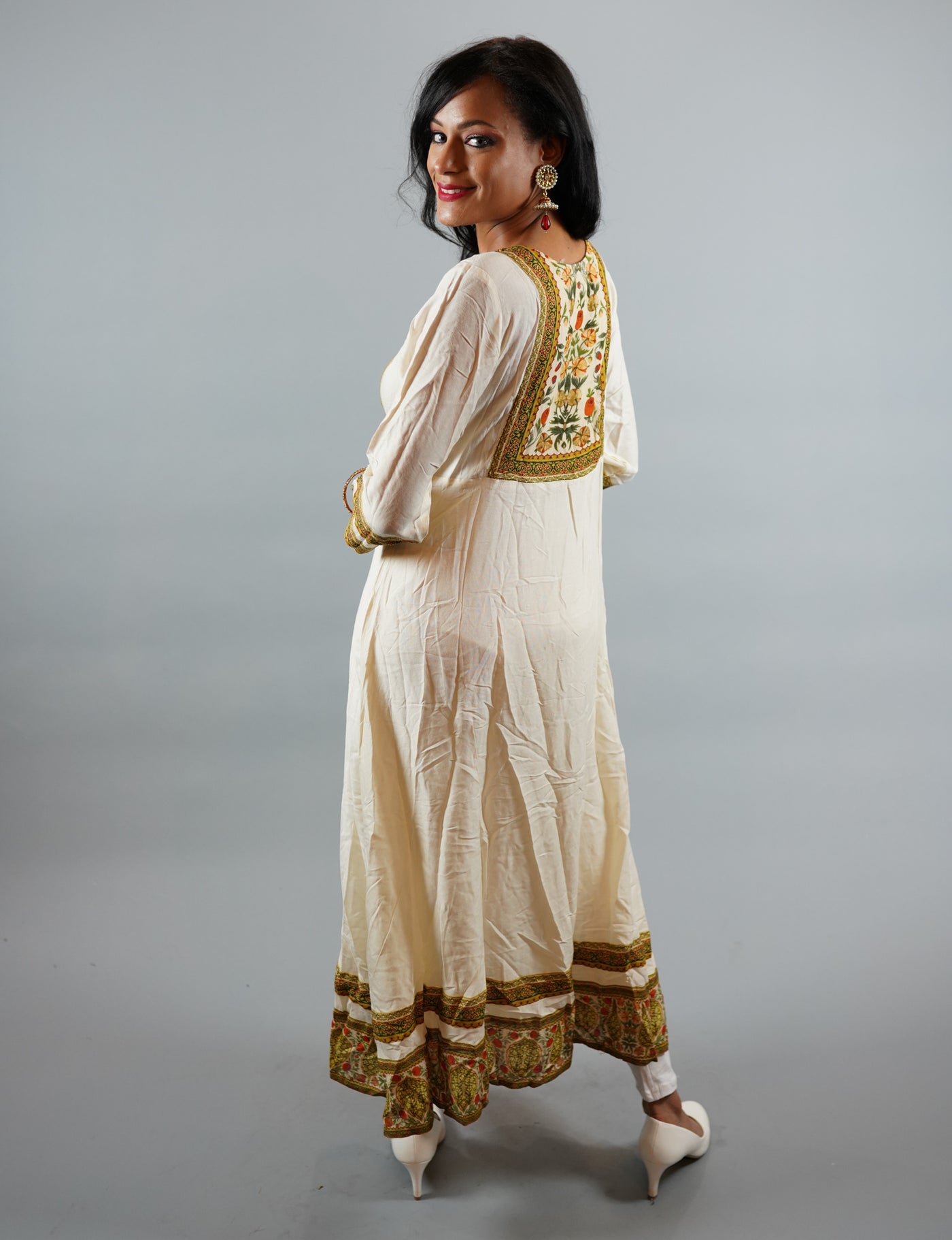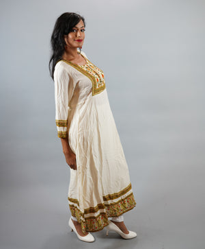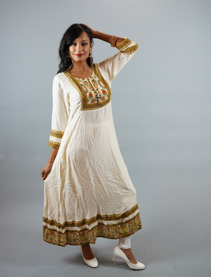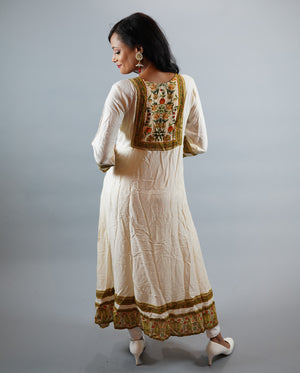 • Handmade Cotton Off White Gown With Printed Border