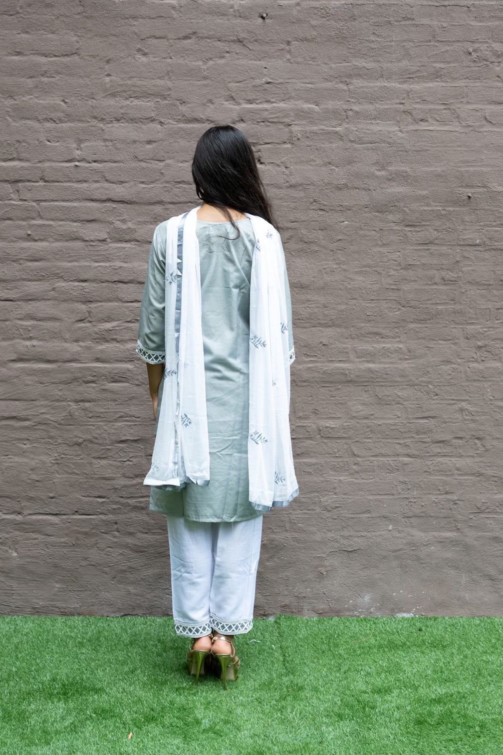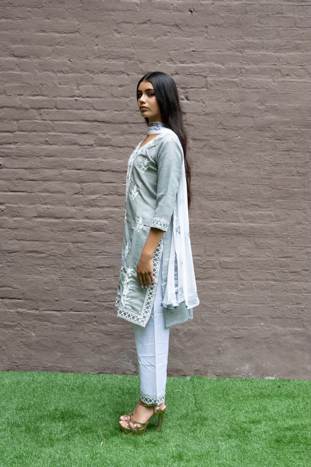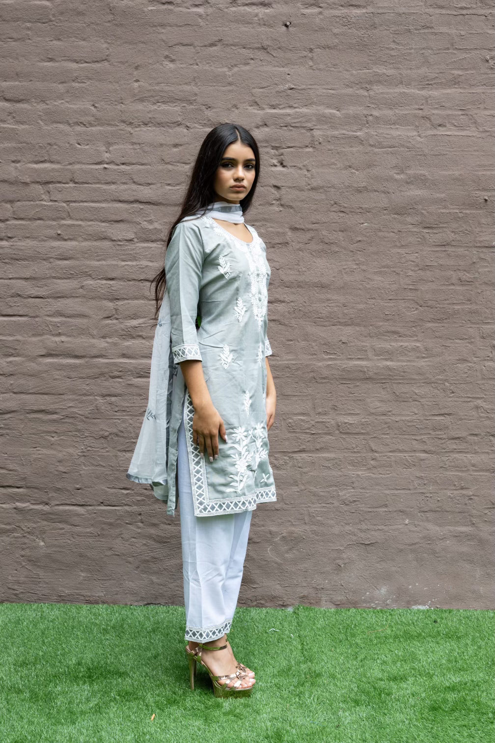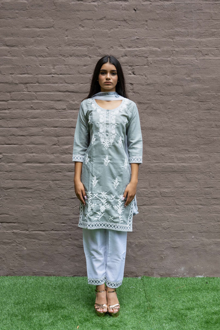 • Handmade Fancy Cotton Silk Embroidered Oslo Grey Salwar Kameez