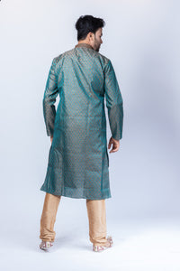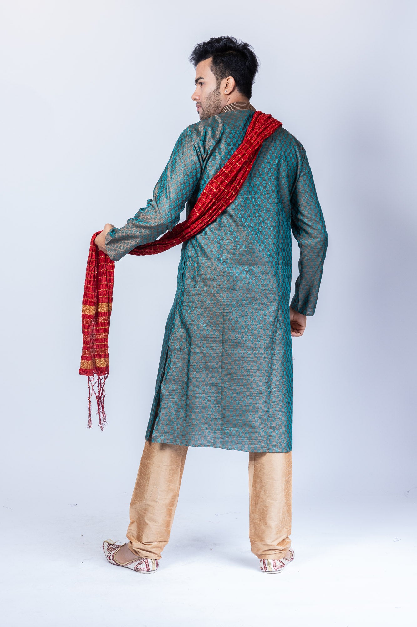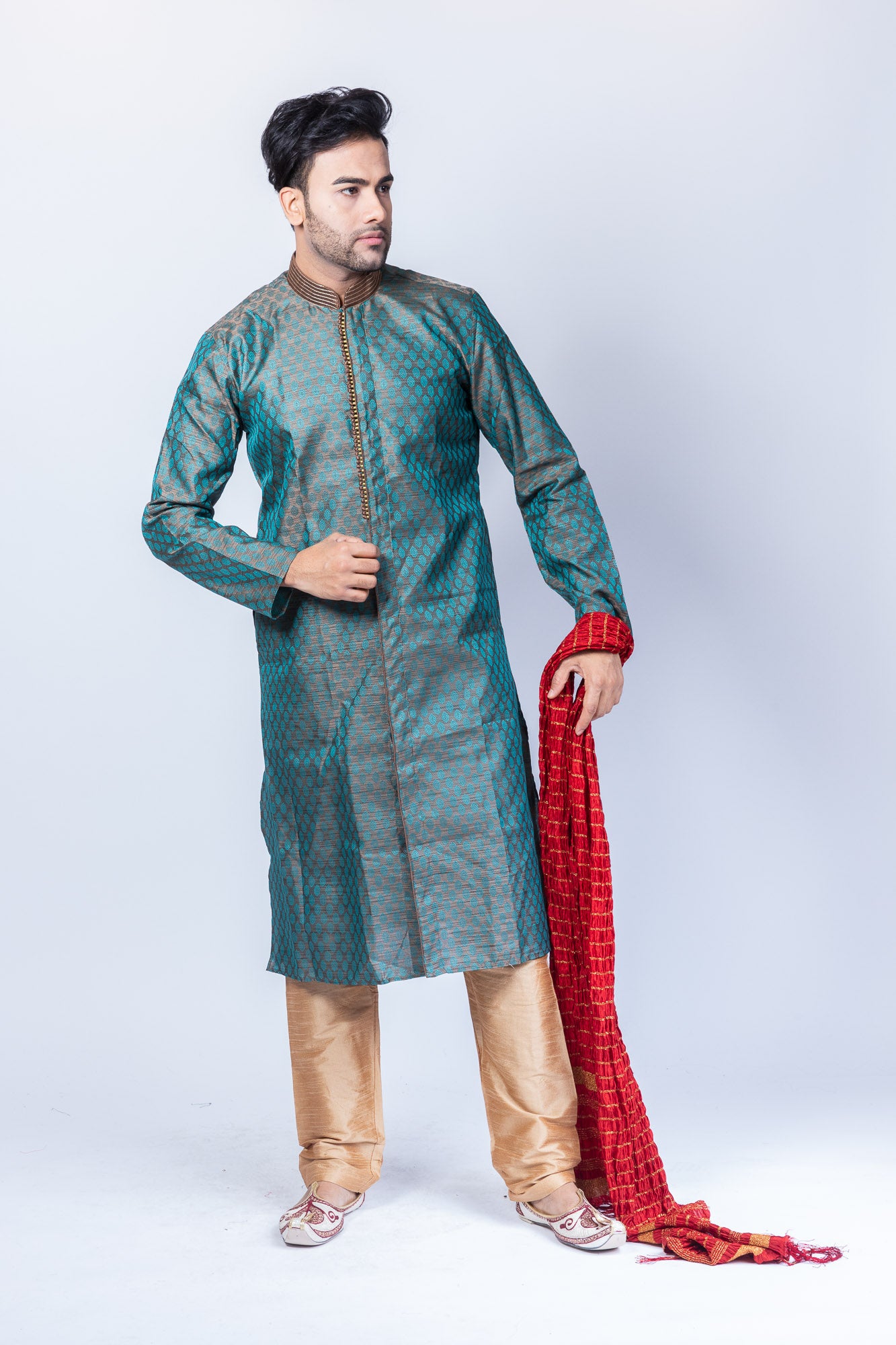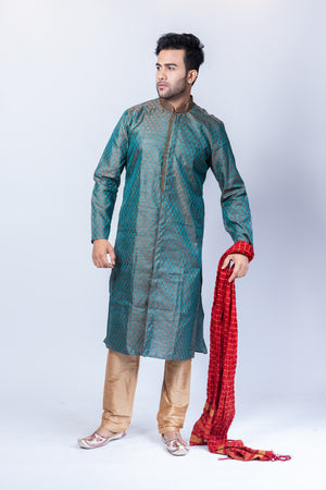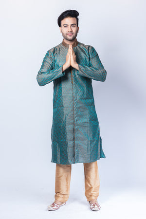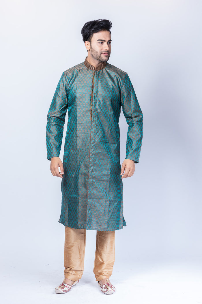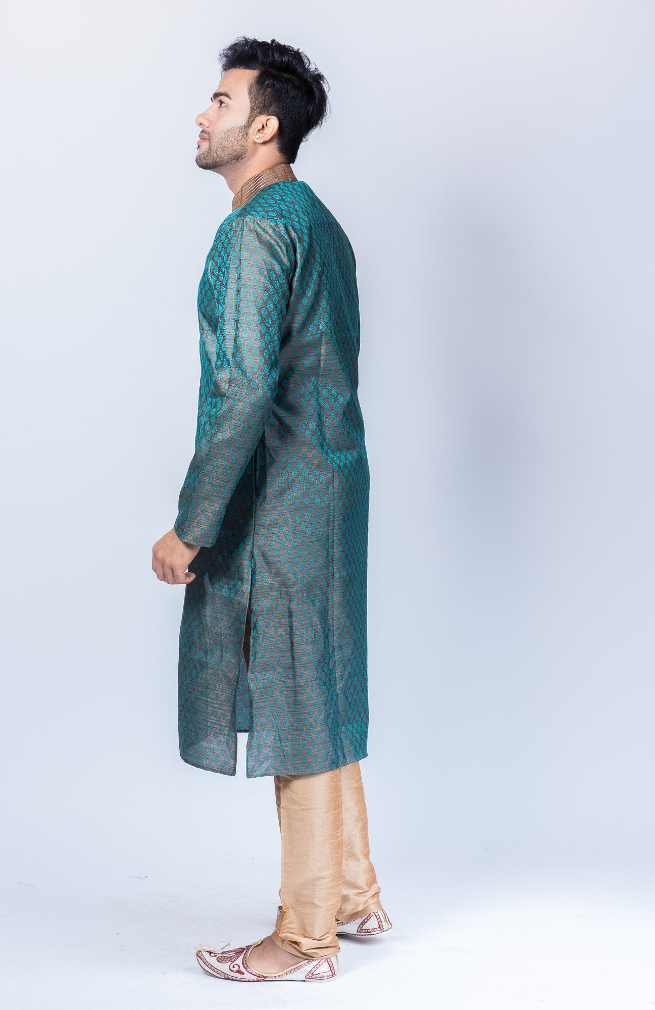 • Handmade Silk Ash Grey With Pine Green All Button Down Men's Kurta