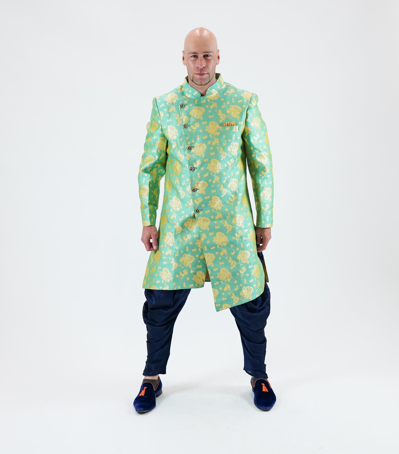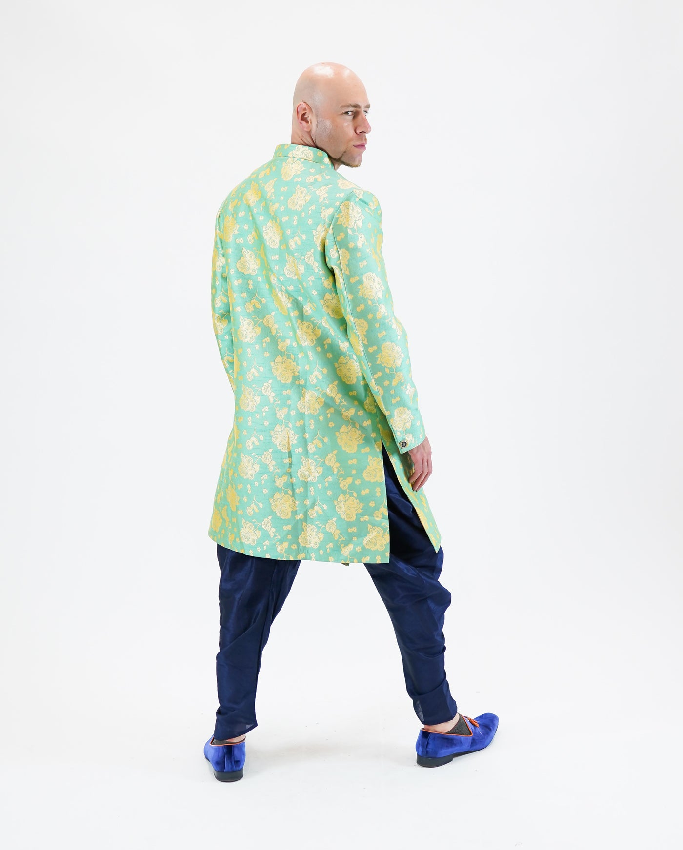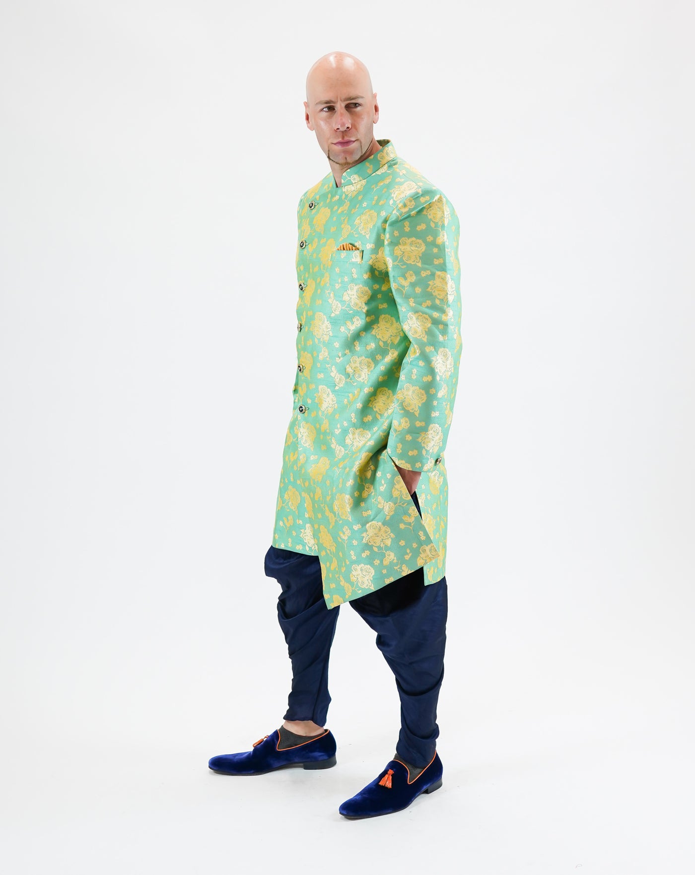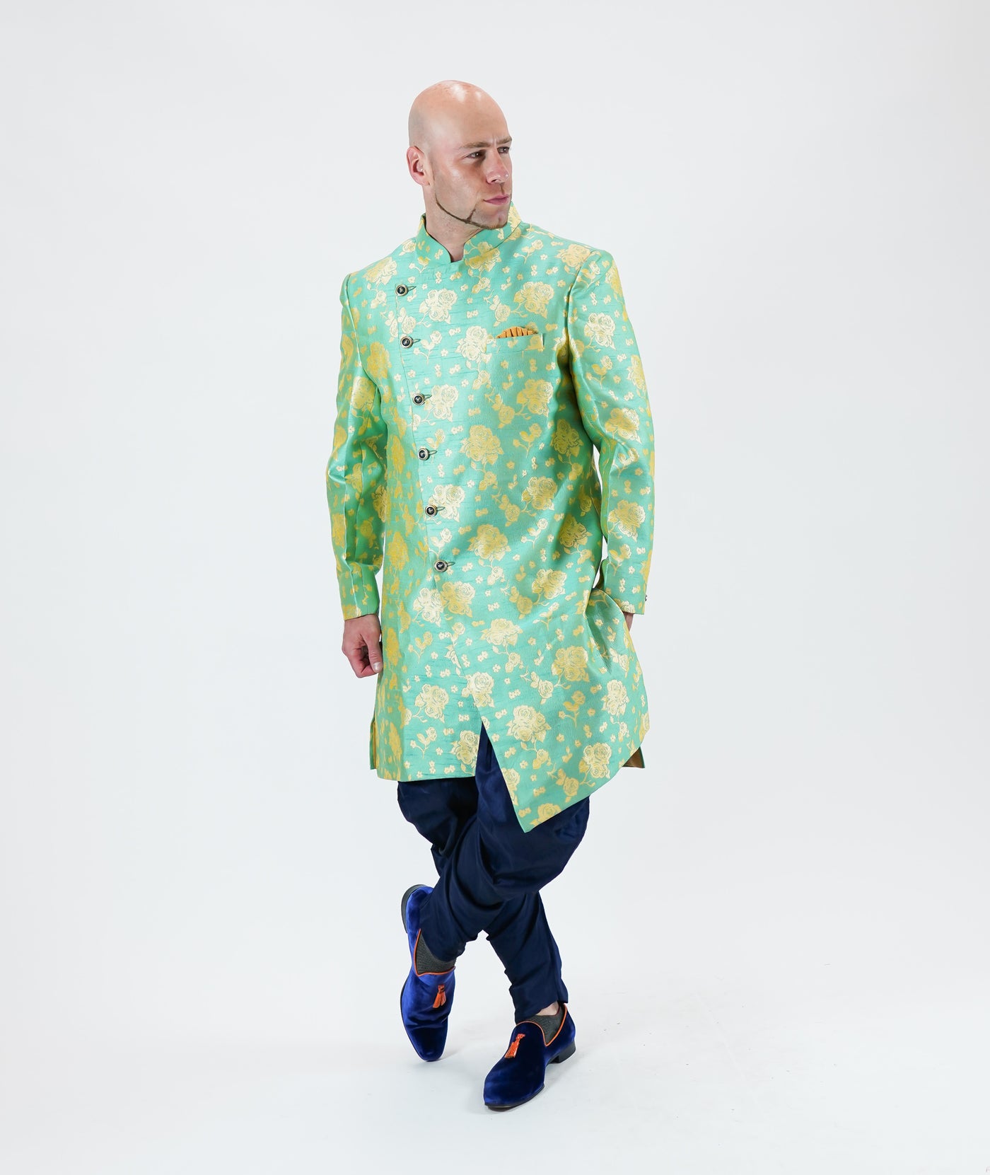 • Handmade Silk Brocade Asymmetric Fern Green Bandhgala Long Sherwani / Jacket