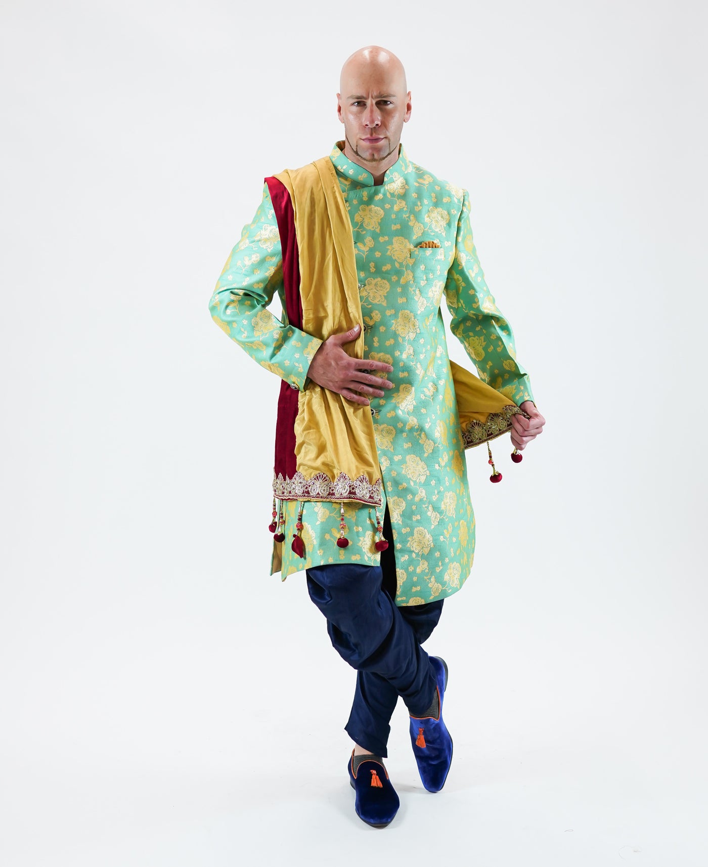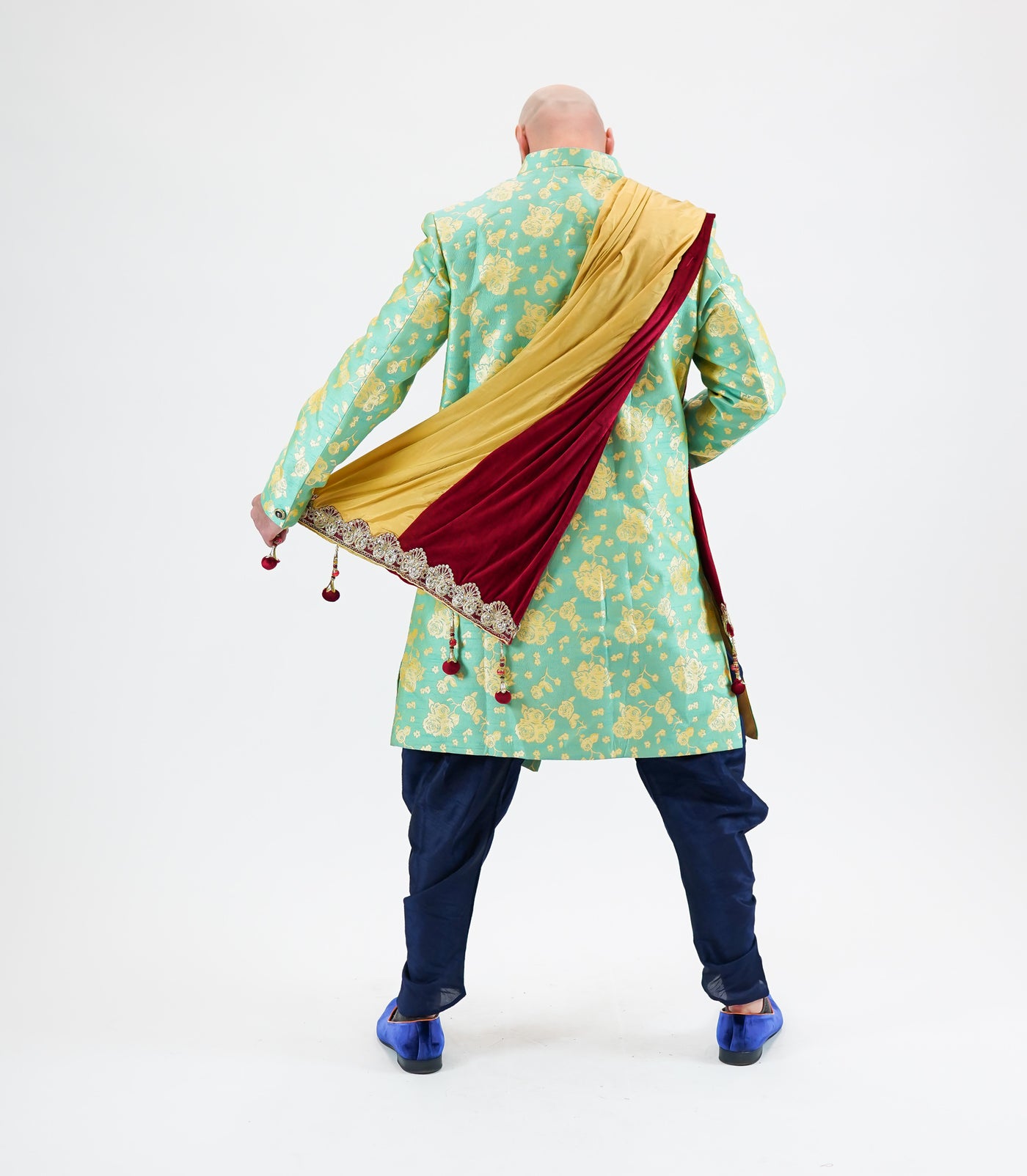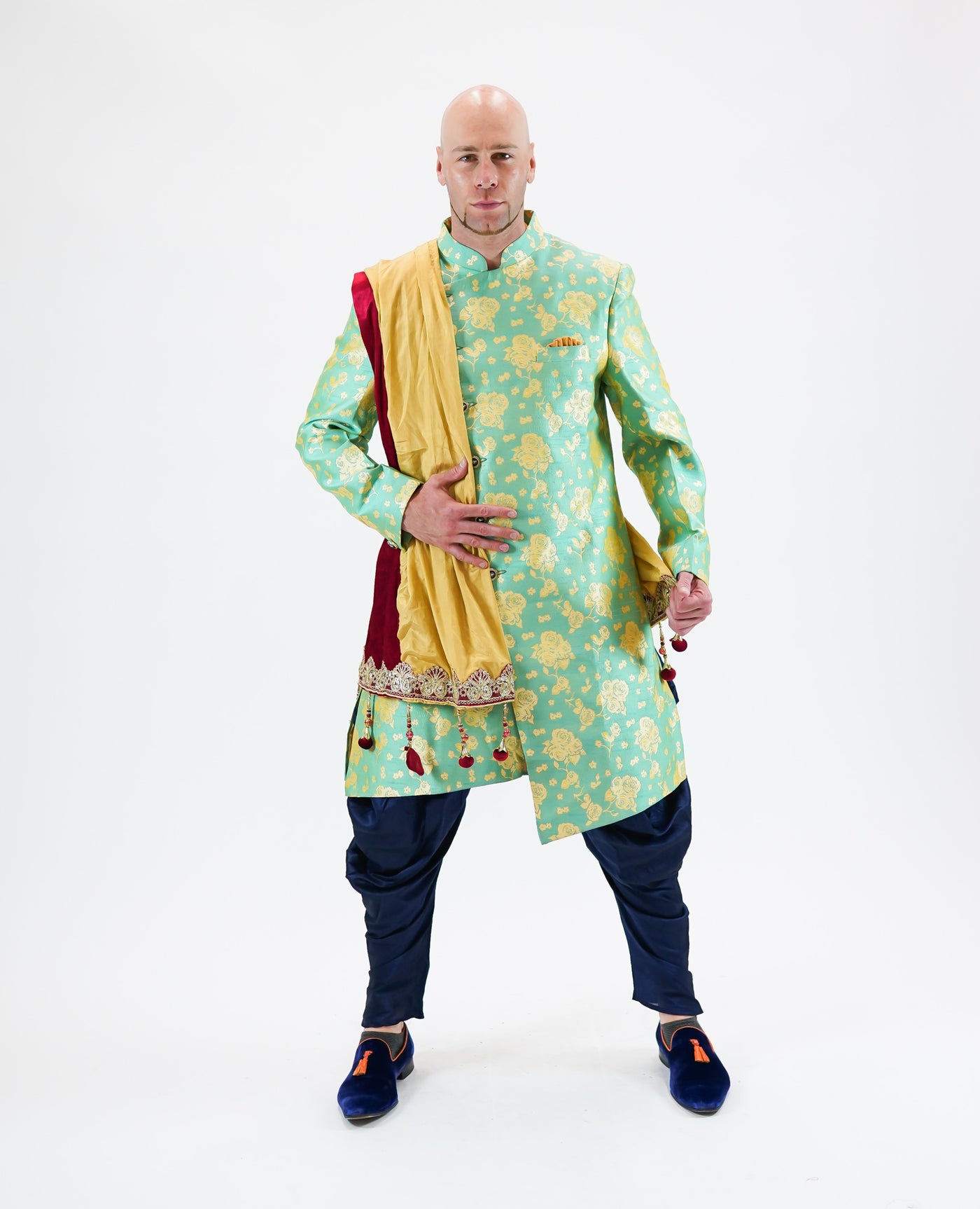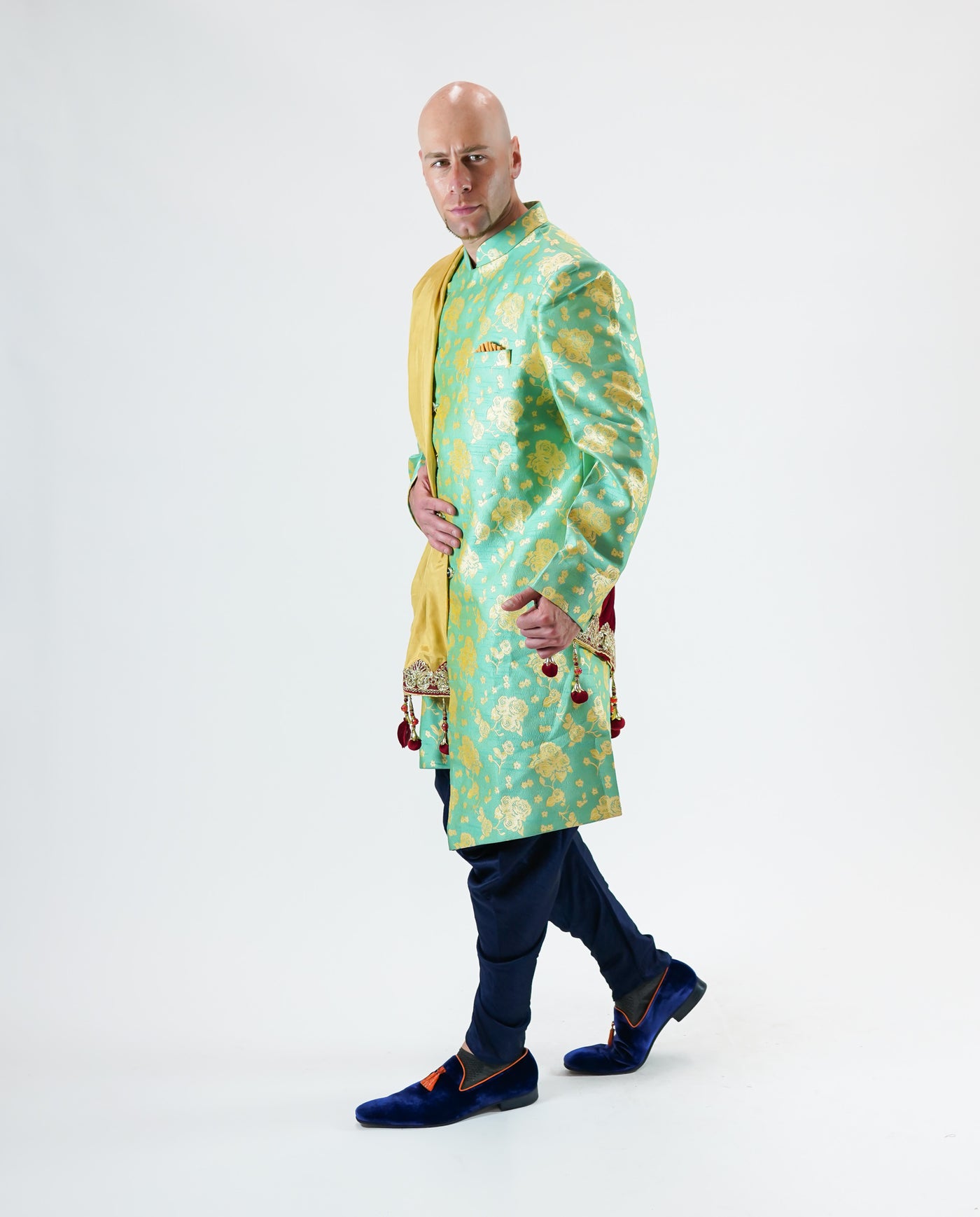 • Handmade Silk Brocade Asymmetric Fern Green Bandhgala Long Sherwani / Jacket