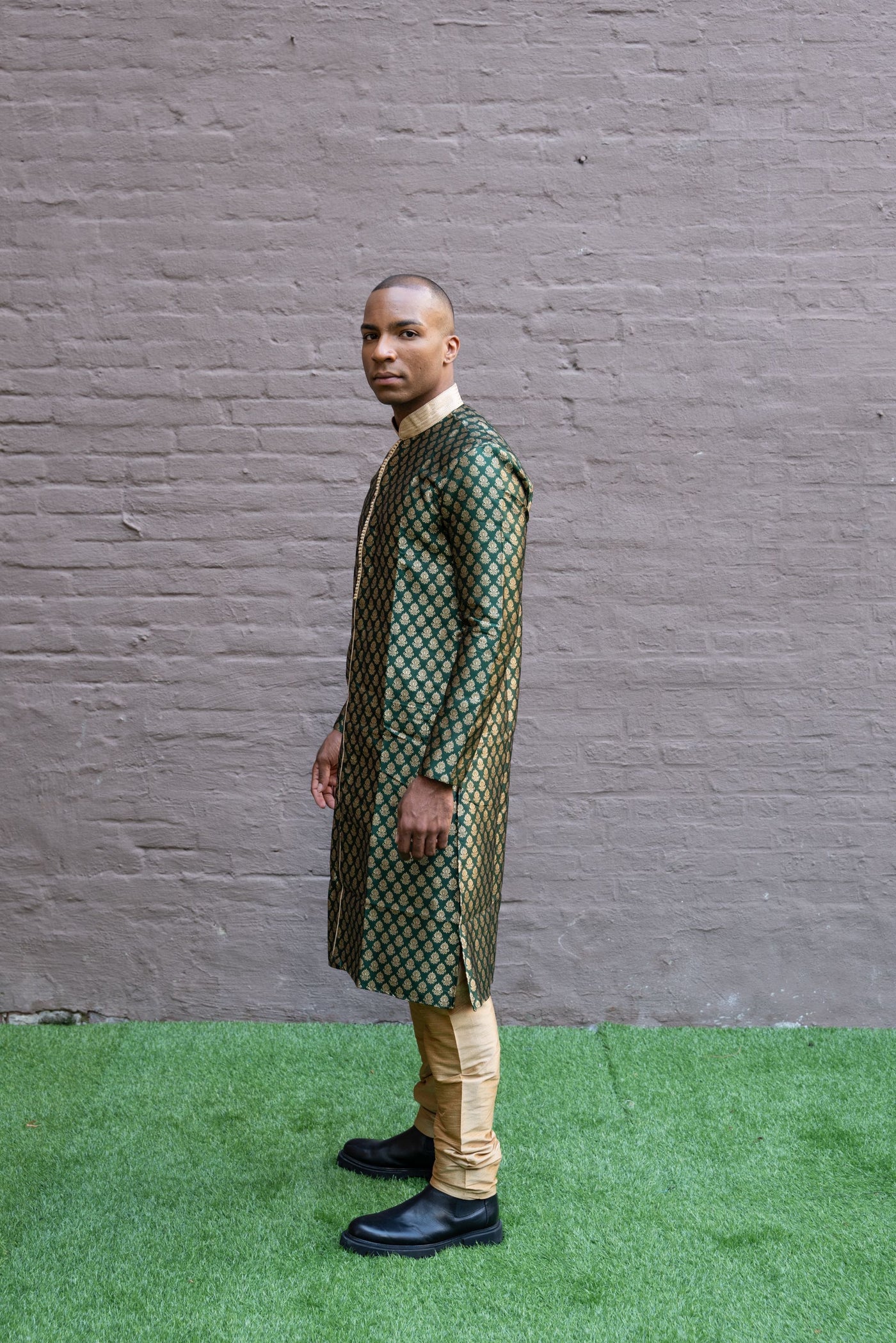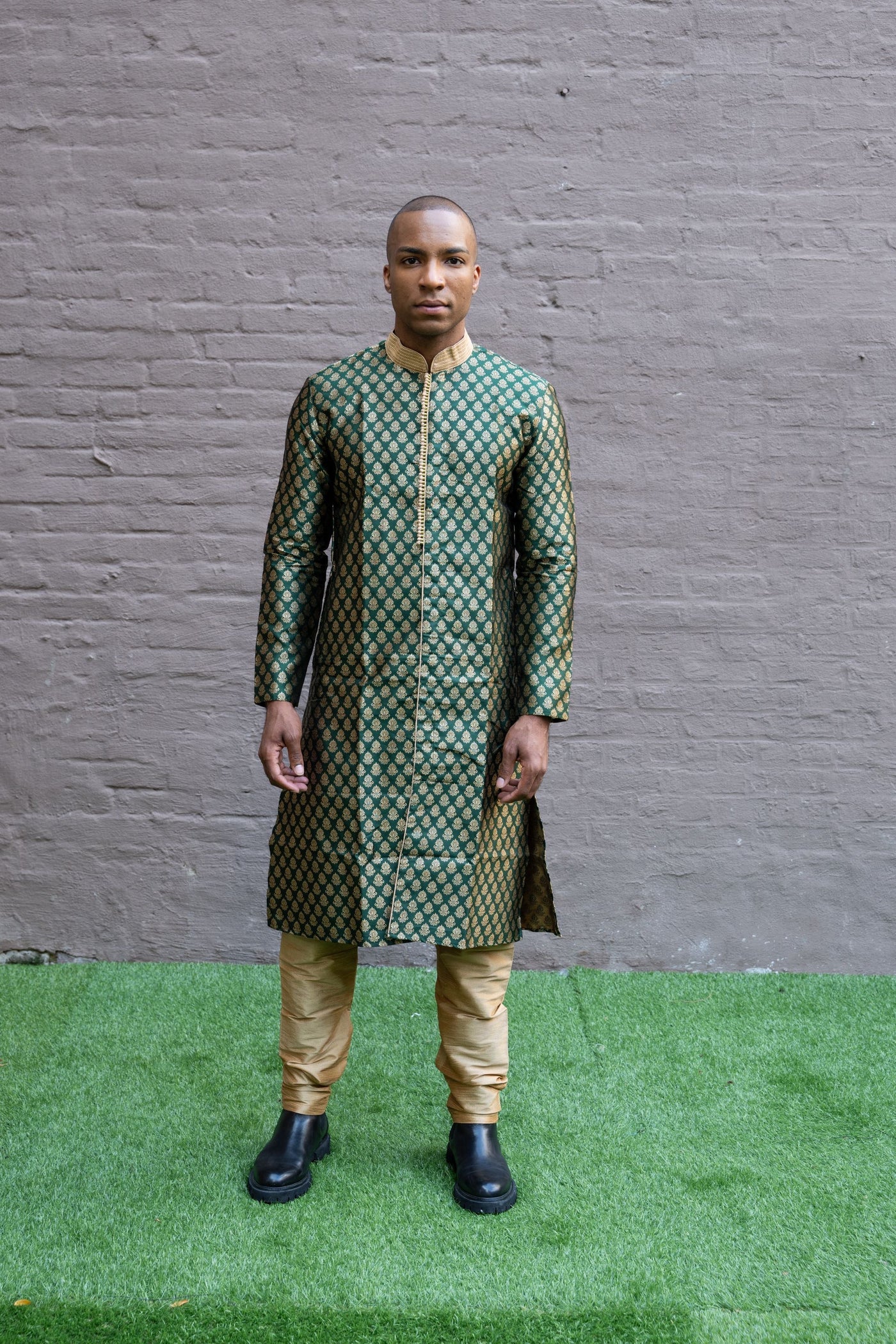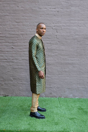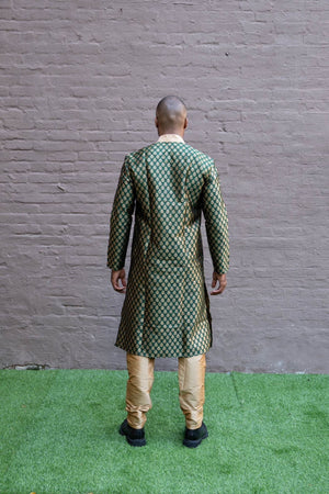 • Handmade Silk Brocade Dark Green All Button Down Men's Kurta