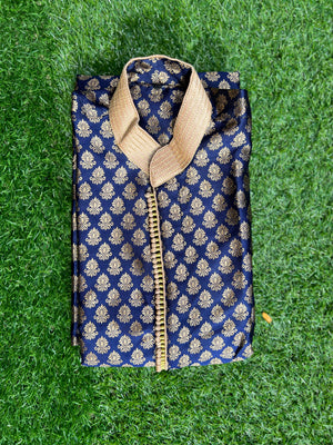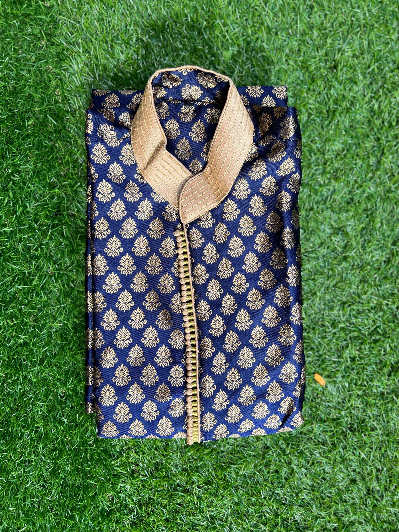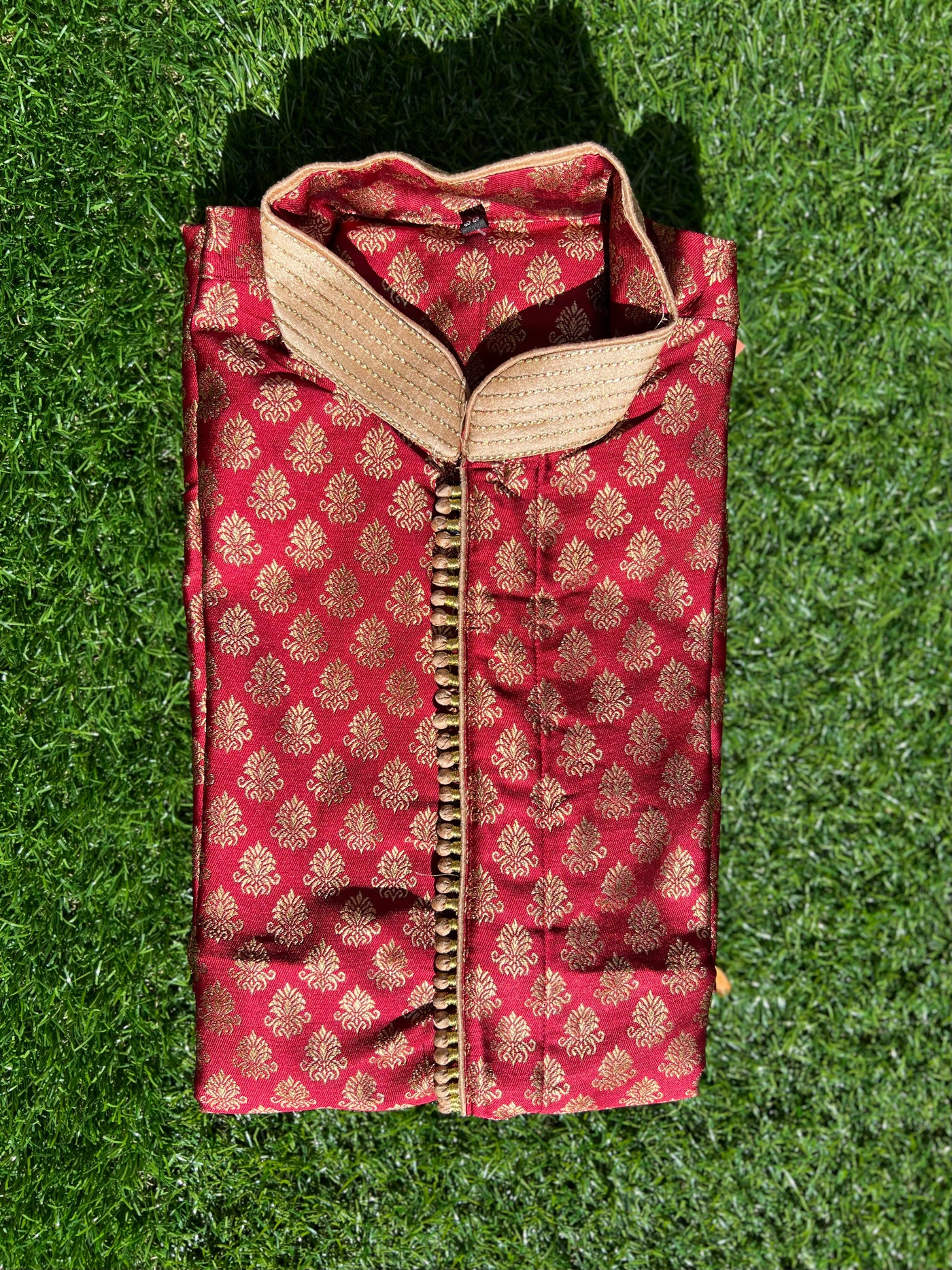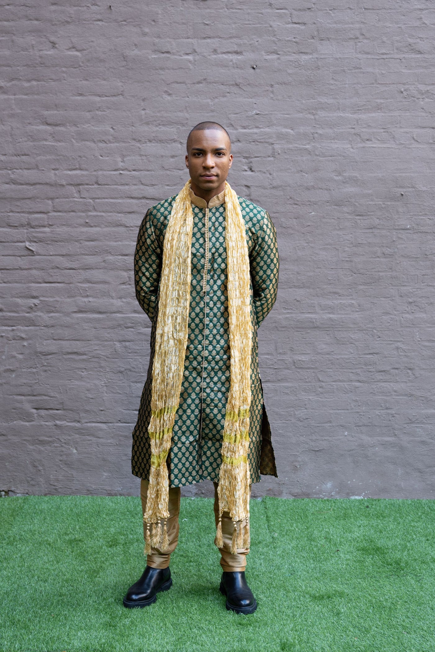 • Handmade Silk Brocade Dark Green All Button Down Men's Kurta