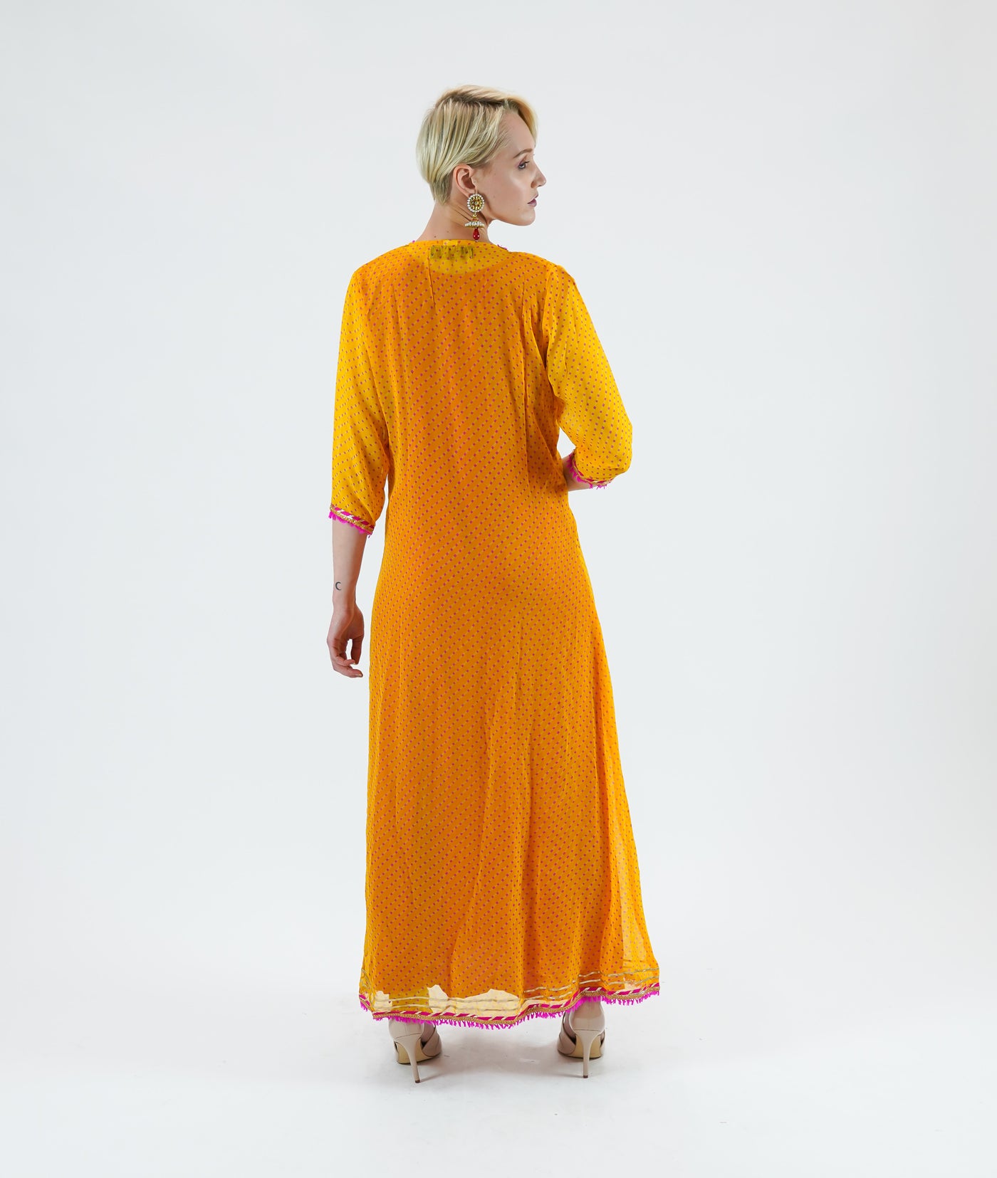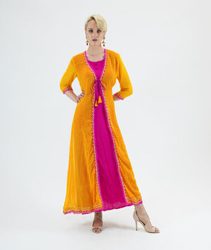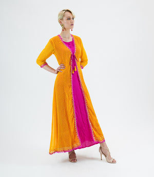 • Handmade Silk Chiffon Two Piece Fuchsia Pink And Canary Yellow Gown