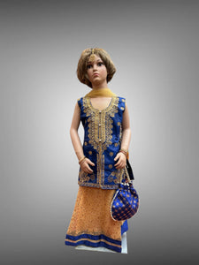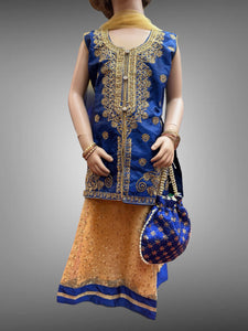 • Comes With Long Iridescent Royal Blue Embroidered Top , Contrast Gold Skirt And  Scarf