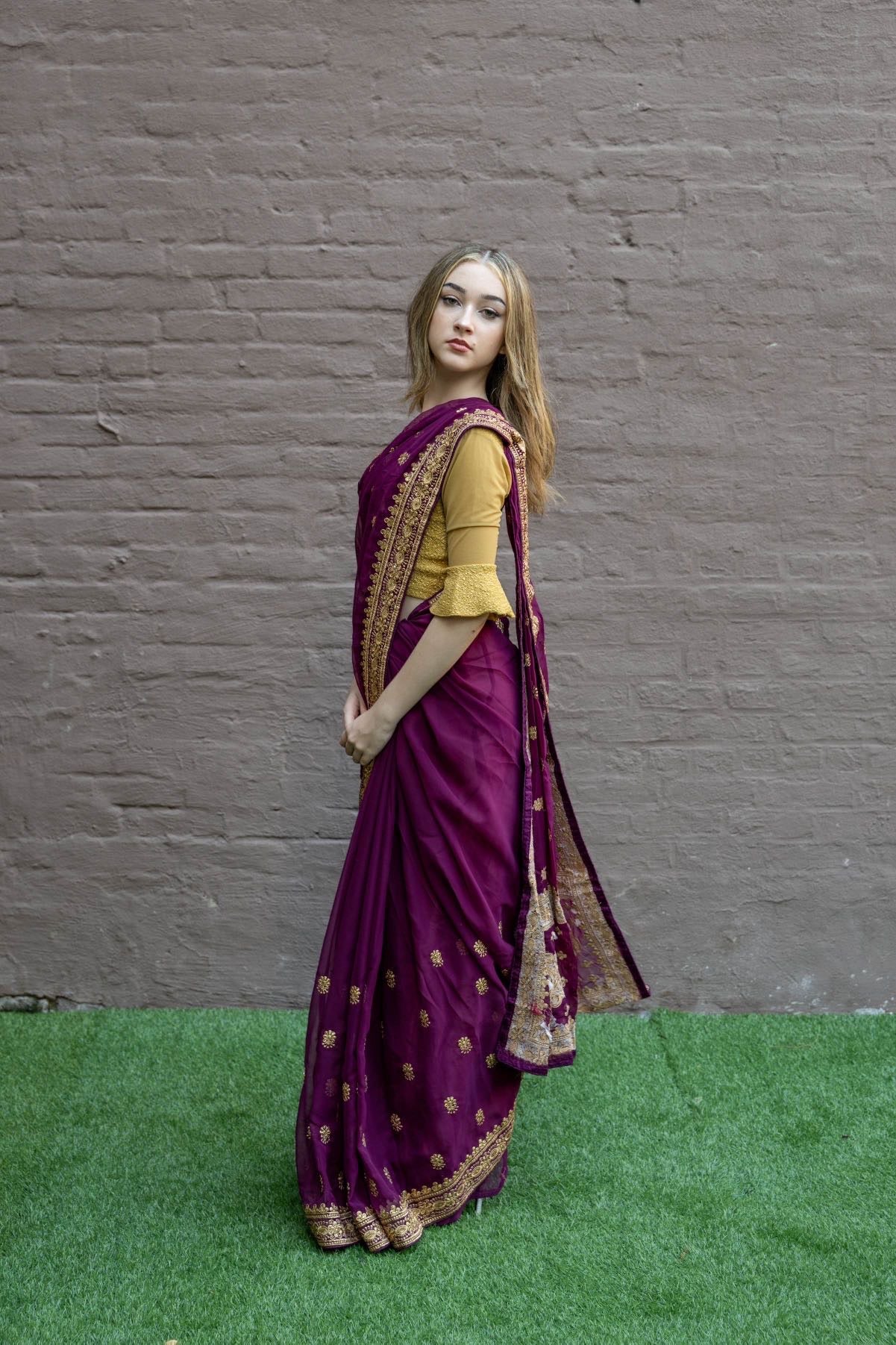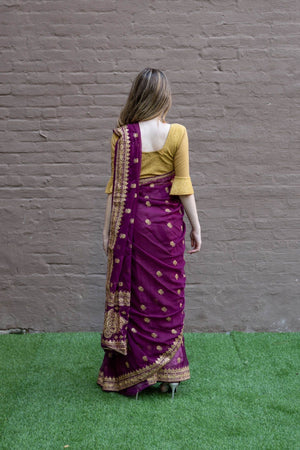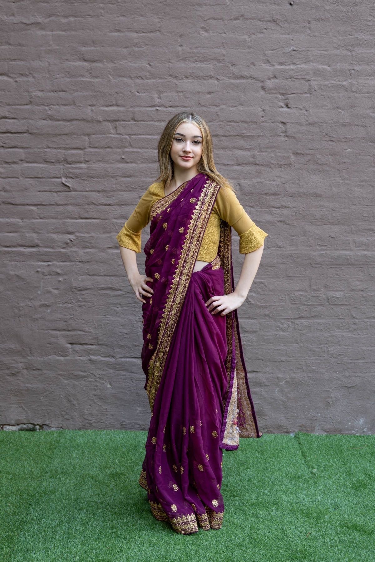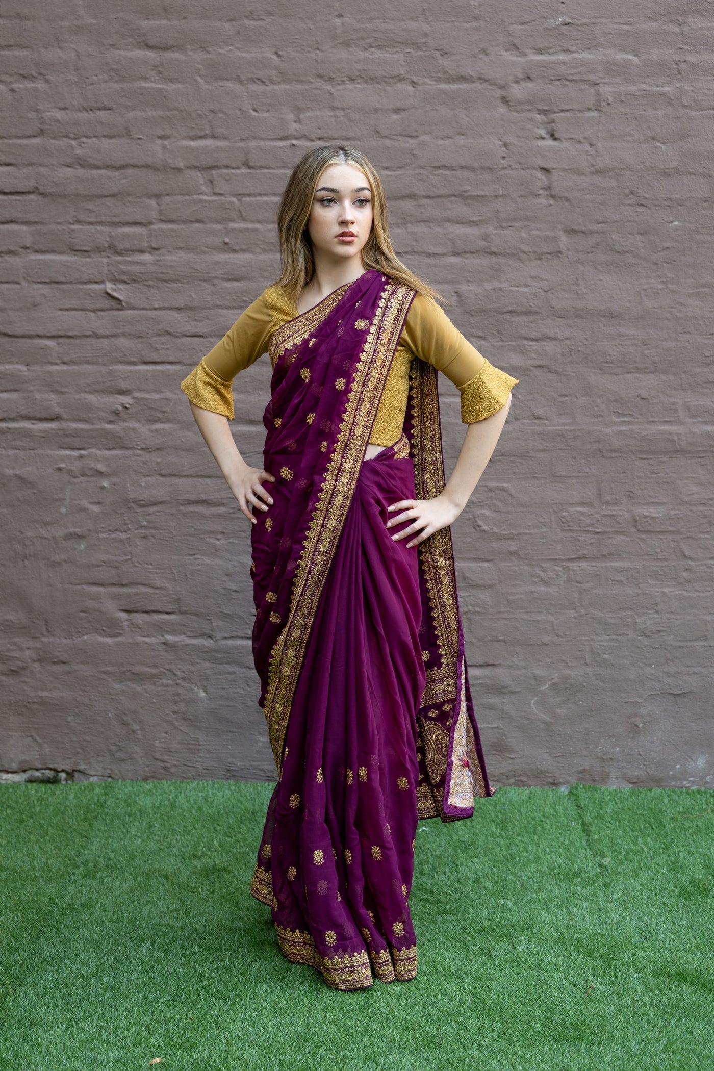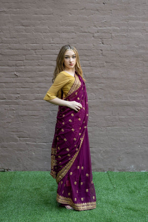 • Handmade Silk Georgette Embroidered  Boysenberry Wine Fully Pleated Saree