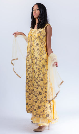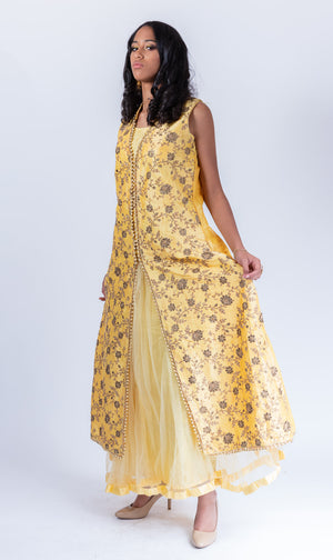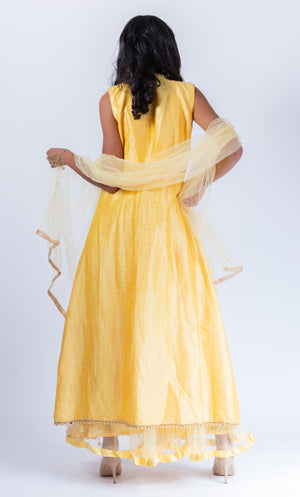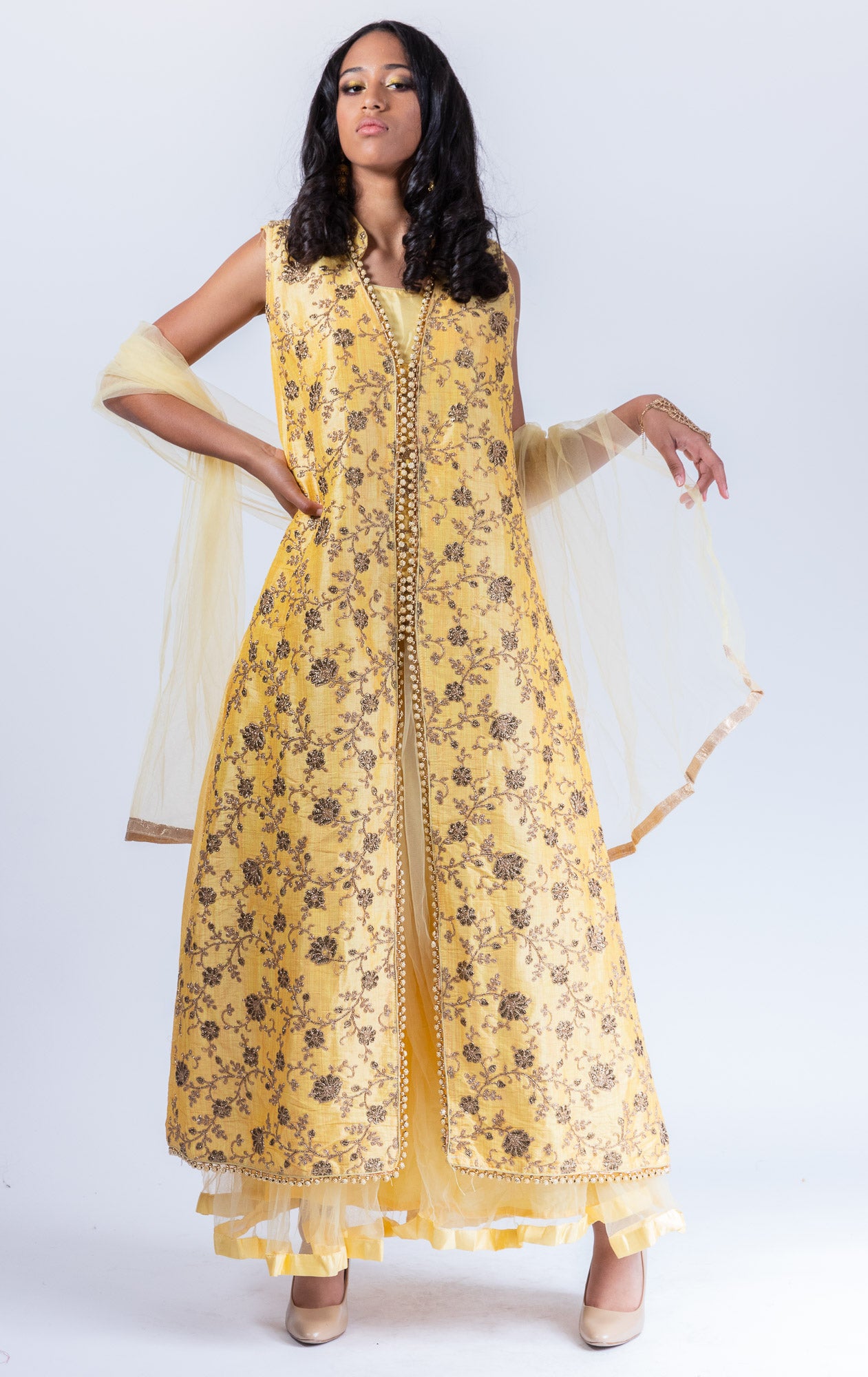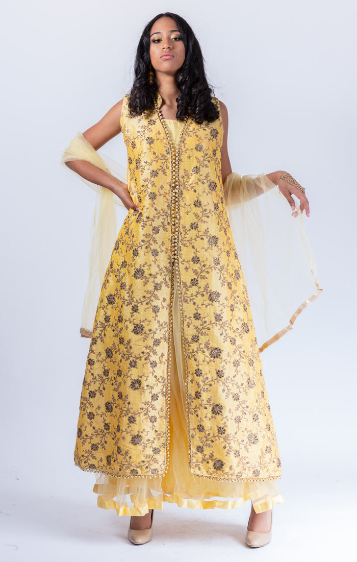 • Handmade Silk Royal Yellow Embroidered With Detachable Jacket Gown