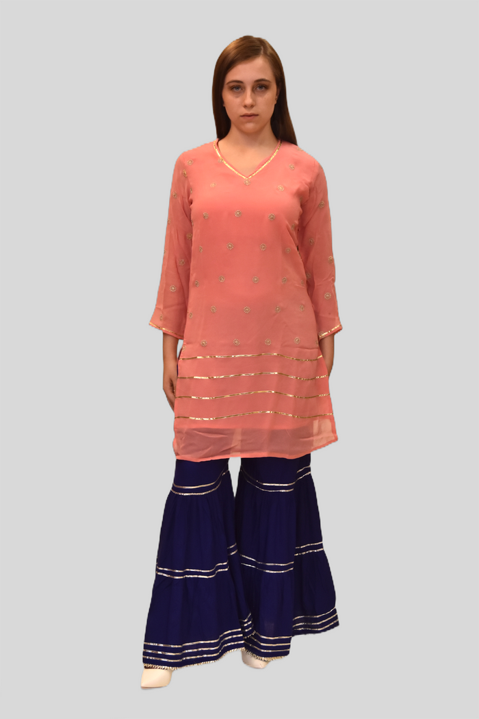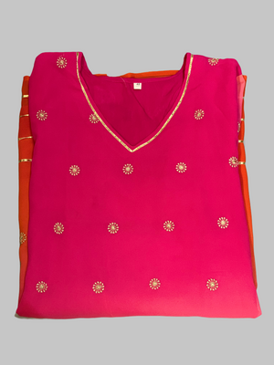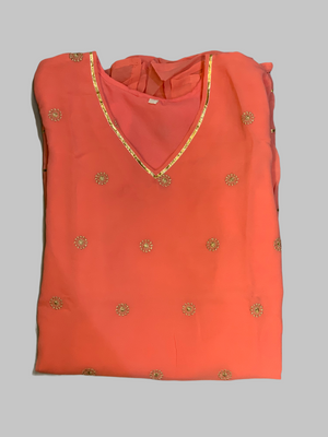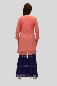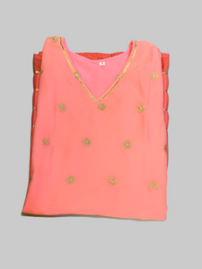 • Handmade Chiffon Cotton Two Toned Salmon Pink Striped With Embroidered Kurti