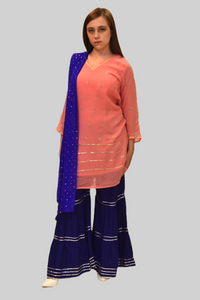 Chiffon Cotton Two Toned Salmon Pink Striped With Embroidered Kurti