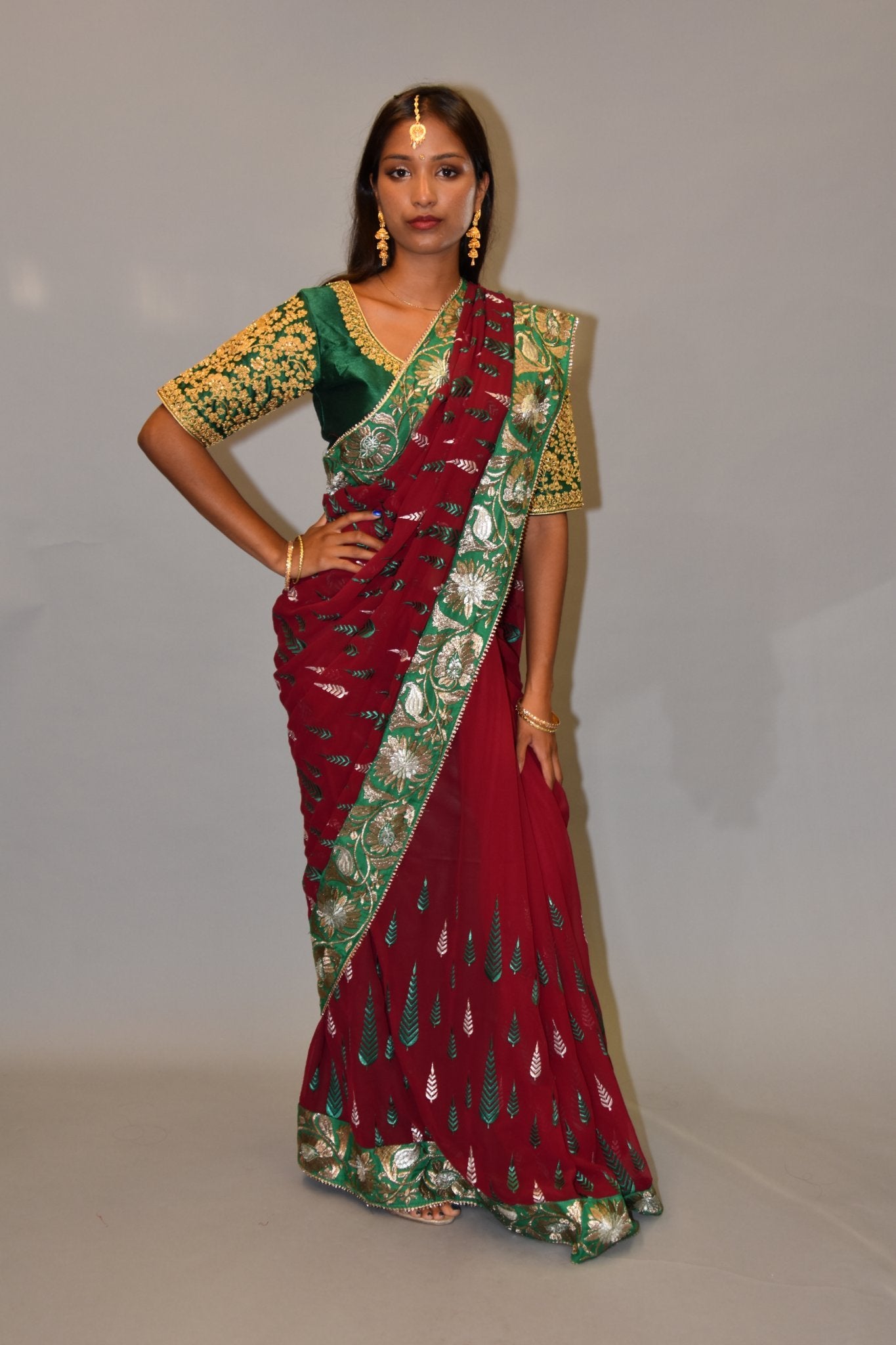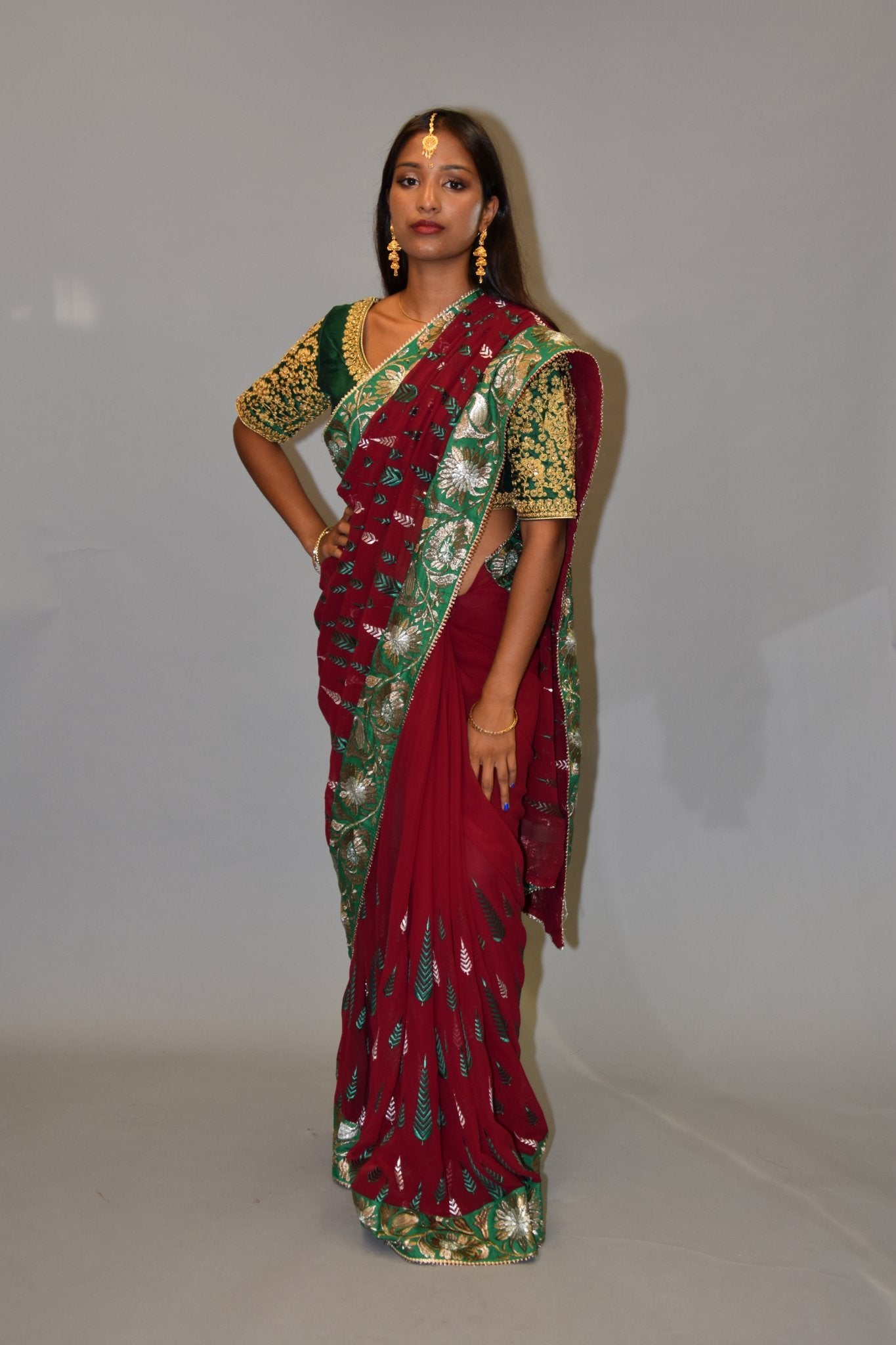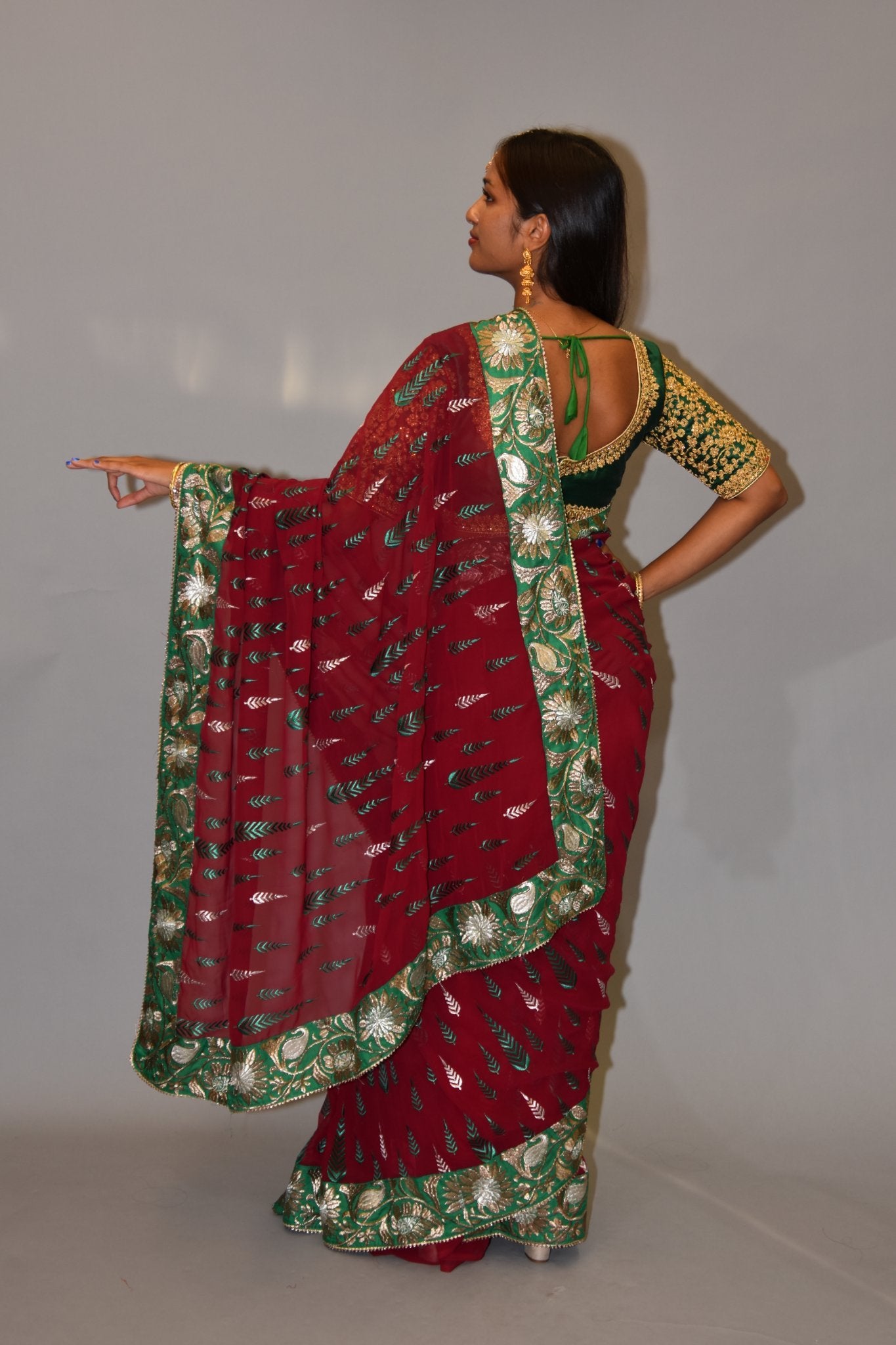• Handmade Heavy Embroidered Silk Georgette Garnet Red Saree With Forest Green, Hint Of Silver & French Gold Border