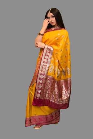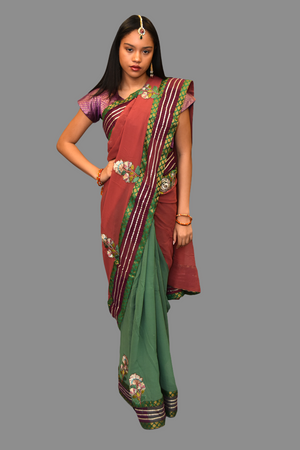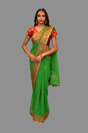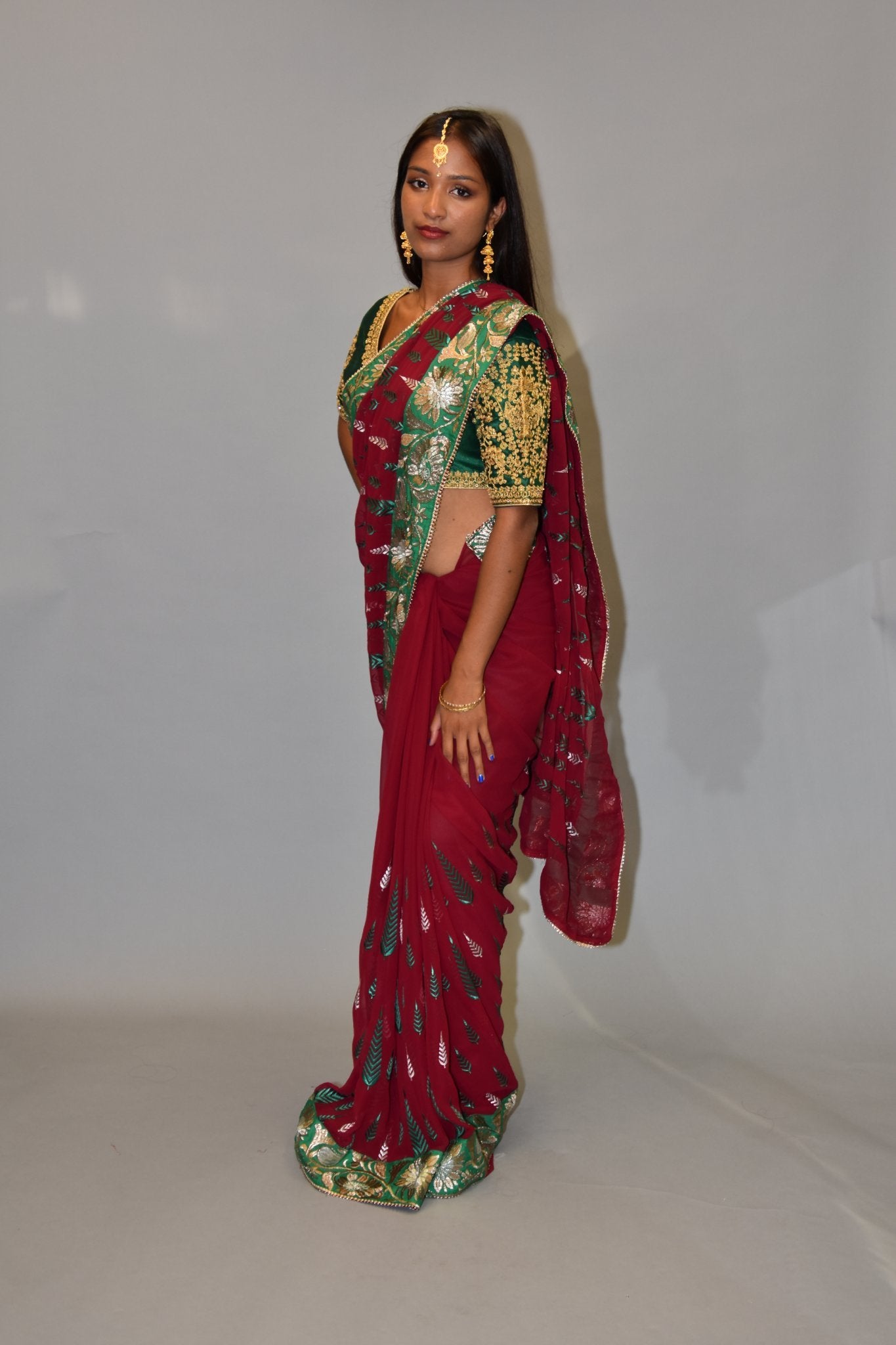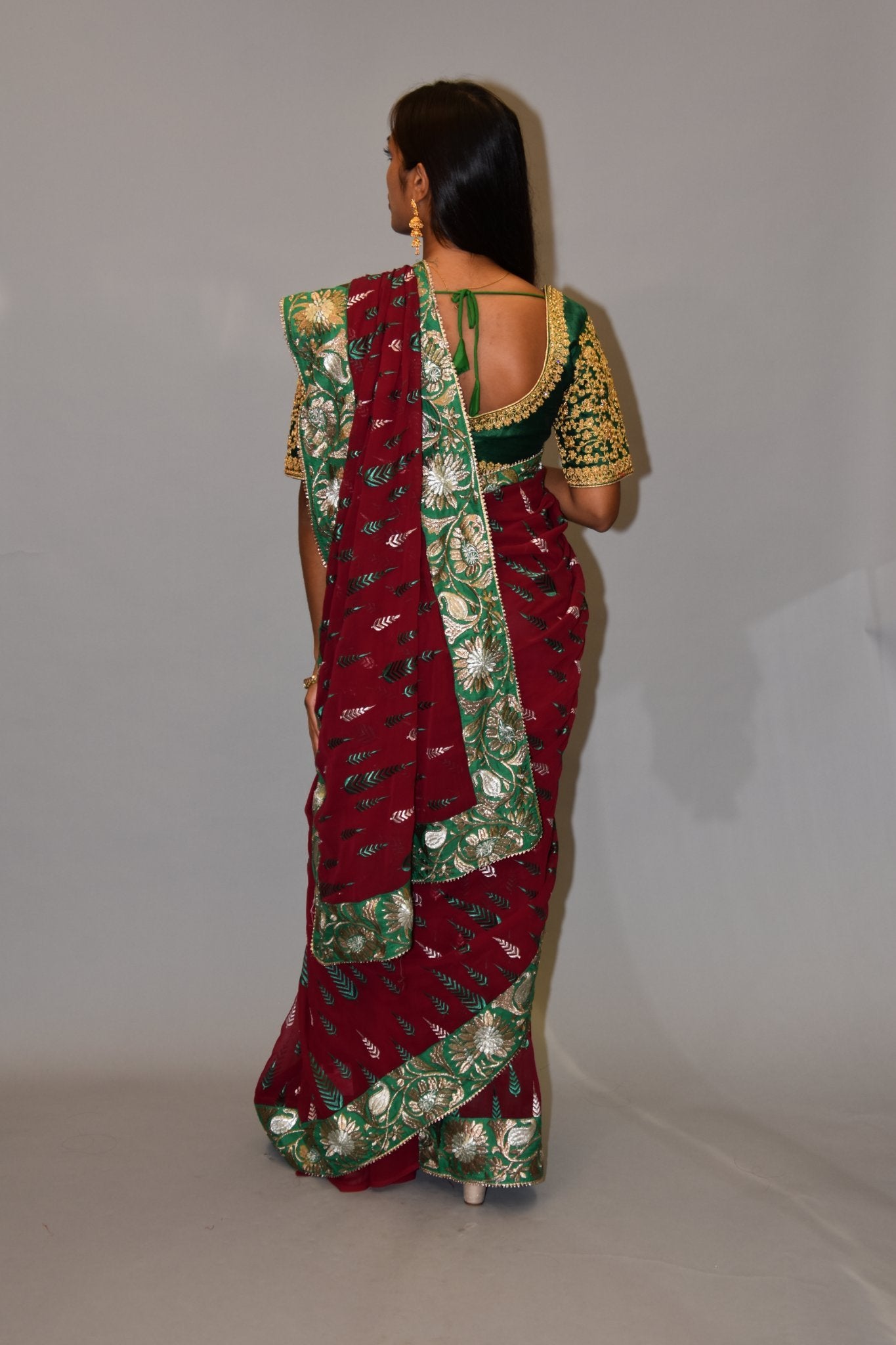 • Handmade Heavy Embroidered Silk Georgette Garnet Red Saree With Forest Green, Hint Of Silver & French Gold Border
