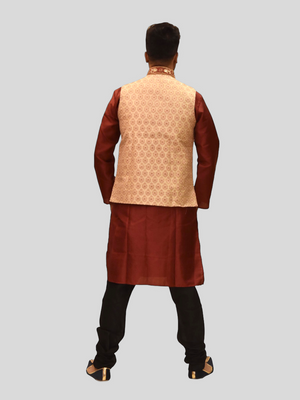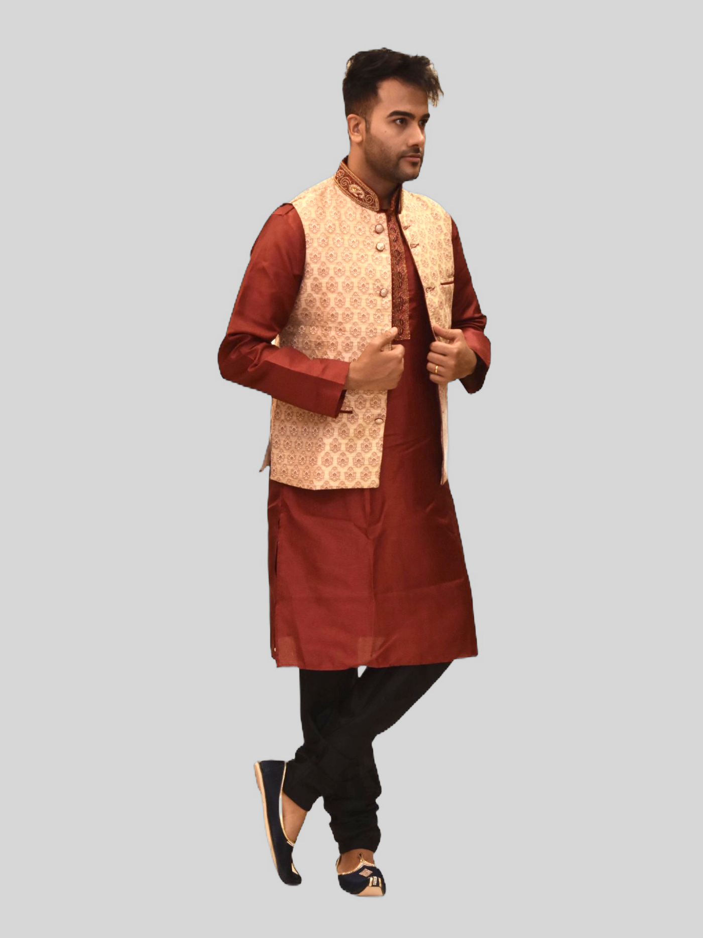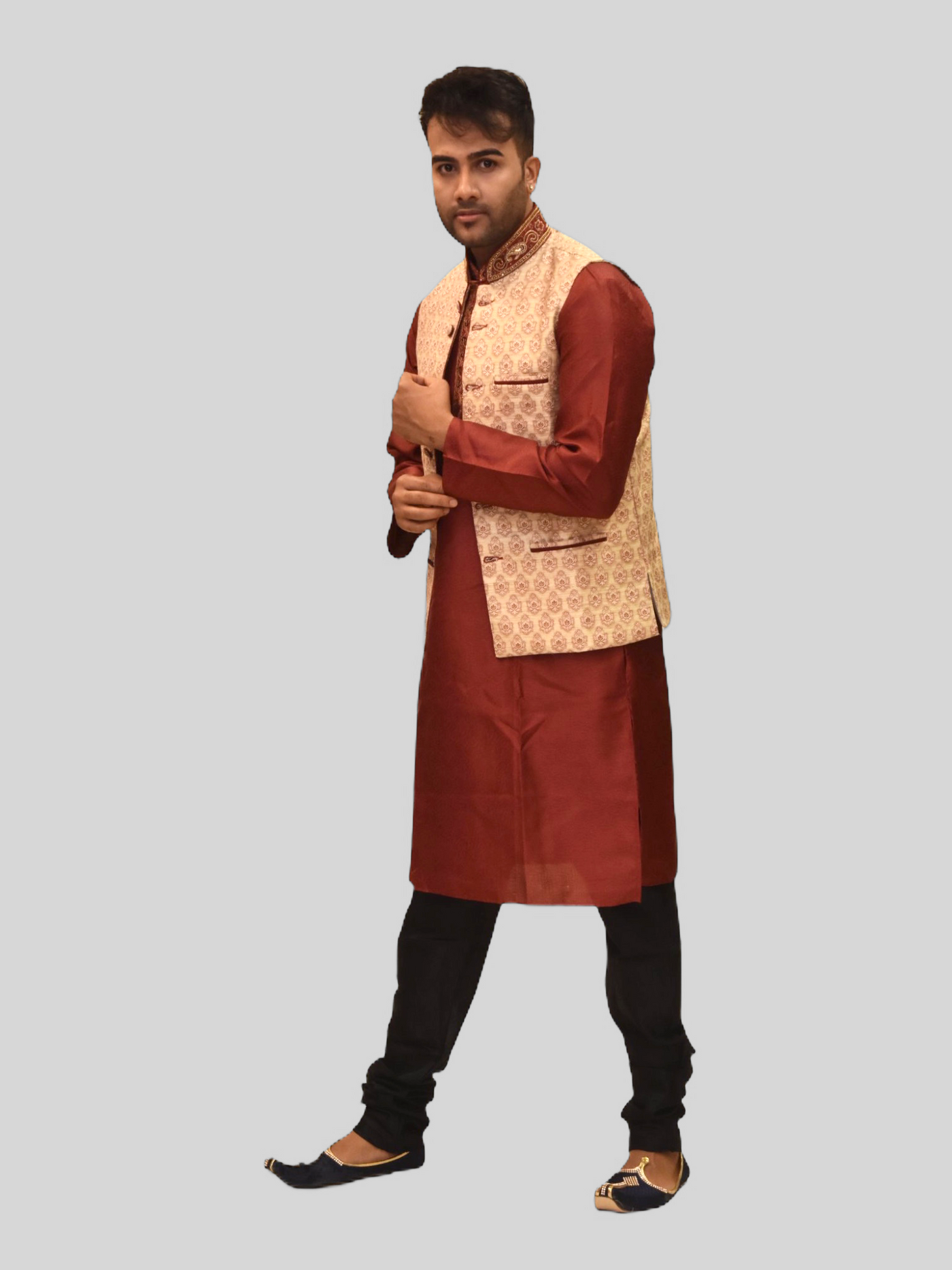 • Silk Maroon Kurta, Black Churidaar Pants & Mojari Sold Separately