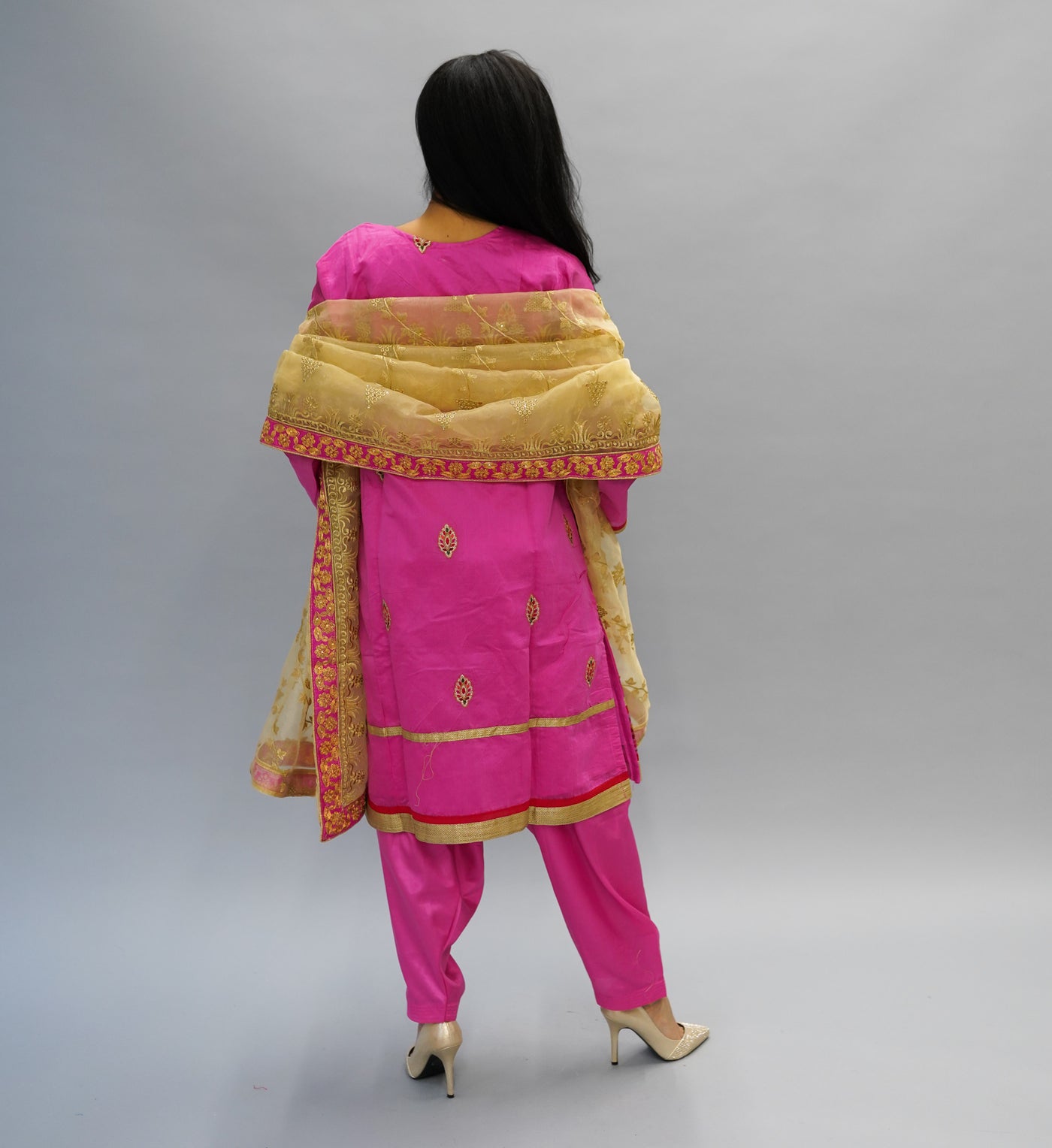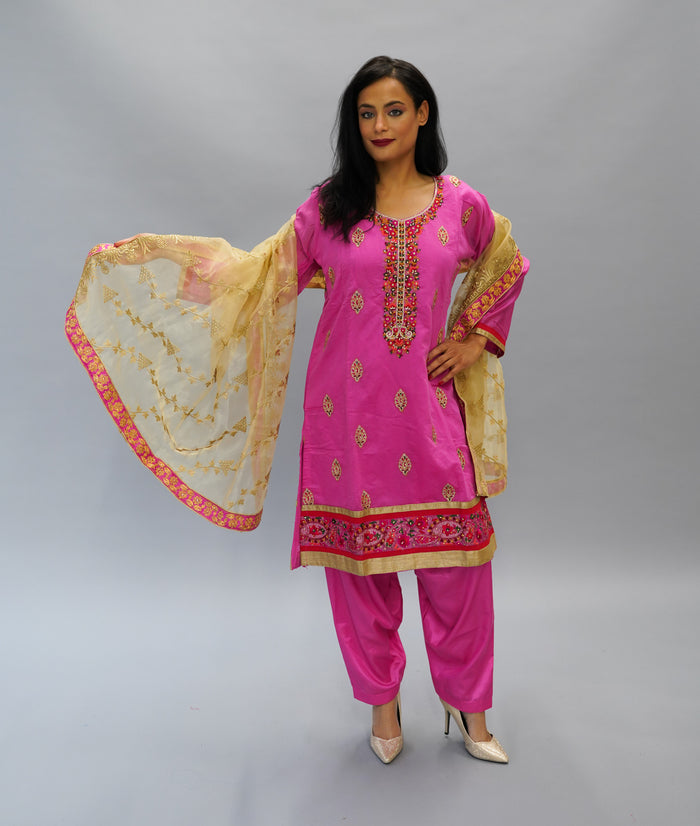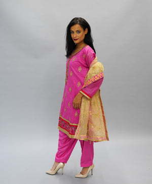 • Comes With Salwar (Pants) & Nice Embroidered Golden Scarf