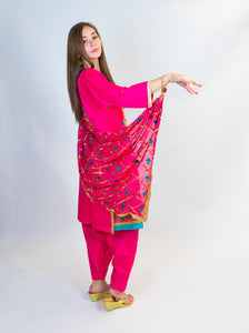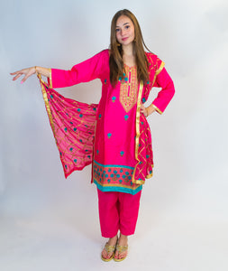• Handmade Cotton Silk Fuchsia with Gold & Blue Embroidered Salwar Kameez