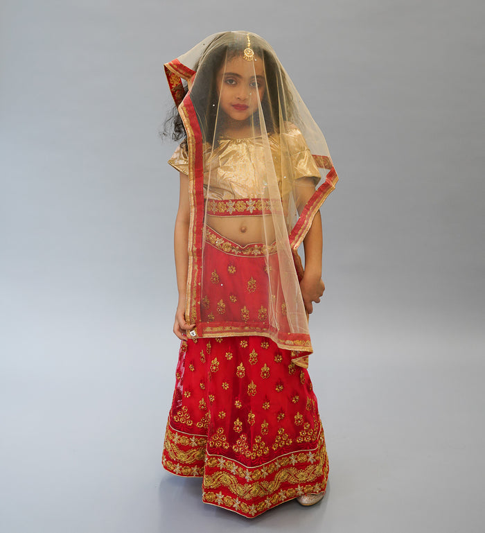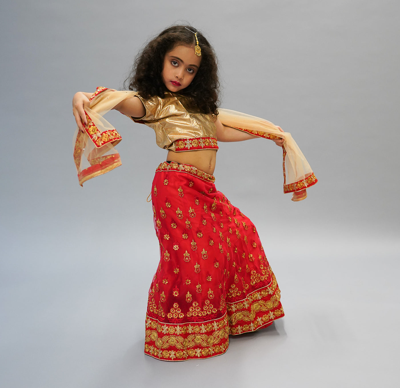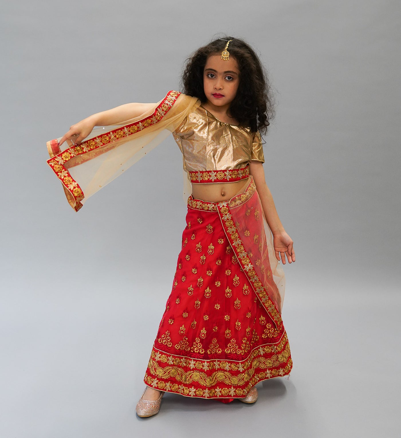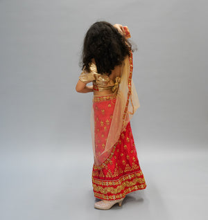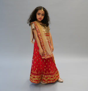 • Handmade Silk and Net Embroidered Red And Gold Children Lehenga