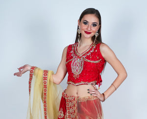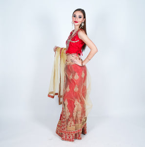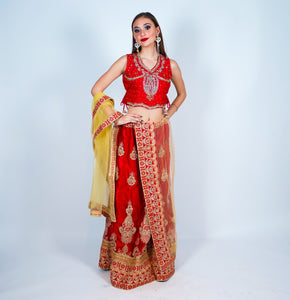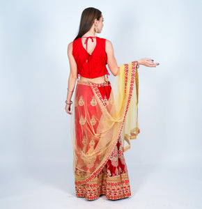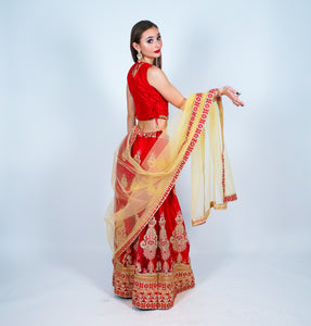• Silk Handmade Auburn Red Full Gold Embroidered Lehenga